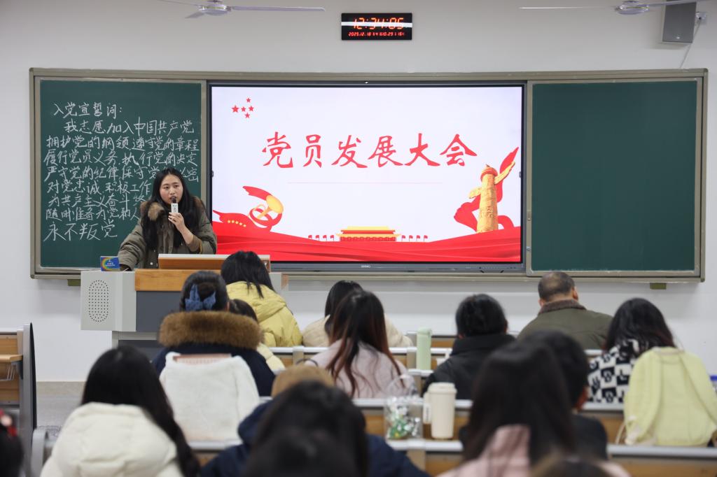 随后,会议严格按照党组织发展党员的程序,分别进行了预备党员转正和新党员发展工作。申请转正的党员和发展对象分别汇报了自身在思想、学习、实践等方面的成长与不足,其培养联系人及与会党员同志对其表现给予了充分肯定,并提出了殷切的期望。在B510教室会场,经过充分讨论与表决,全票通过了2名预备党员的转正申请,并同意接收4名发展对象为中共预备党员。在B511教室会场,经无记名投票表决,7名发展对象全票通过,被按期接收为中共预备党员;7名预备党员全票通过,按期转为中共正式党员。