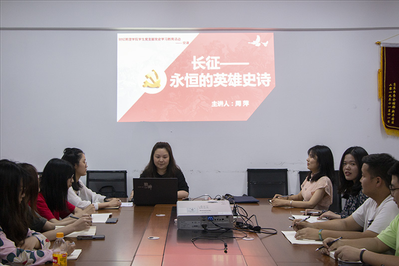本次党史学习教育围绕“长征的艰辛历程”展开,内容主要包括湘江之战、遵义会议、四渡赤水河、以及飞夺泸定桥等重要历史事件。周萍书记通过丰富的图文、生动的故事、以及相关视频详细介绍了红军艰苦卓绝的奋斗历程;系统讲述了红军长征时期的重大历史事件和留给后人的宝贵精神财富;全面阐释了长征精神的历史作用和深刻内涵,红军战士们“翻雪山,跨草坪”筚路蓝缕、披肝沥胆的身影历历在目。周萍书记带领大家重温那段战火硝烟的峥嵘岁月,让大家进一步理解长征精神。活动临近尾声,周萍书记用“艰难困苦,玉汝于成”的精神总结了长征的胜利,号召我们要大力弘扬长征精神,用长征精神激励和鼓舞我们青年一代发奋图强、奋发有为,继续把革命先前辈开创的伟大事业向前推进。