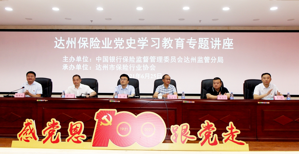 为响应达州市委“学党史、悟三新、应七问”部署,推动达州保险业高质量发展,2021年6月25日中国银行保险监督管理委员会达州监管分局主办、达州市保险行业协会承办“达州保险业党史学习教育专题讲座”在达州电大礼堂举行。经理傅忠贤教授受邀做“学习党史、涵养情怀、增强党性”专题讲座。达州银保监局党委书记、局长梁超,副局长石一、满溢滔,达州银保监协会会长车紀出席,达州银保监协会秘书长陈强主持。达州银保险协会会员单位40余个300余人参加专题教育。