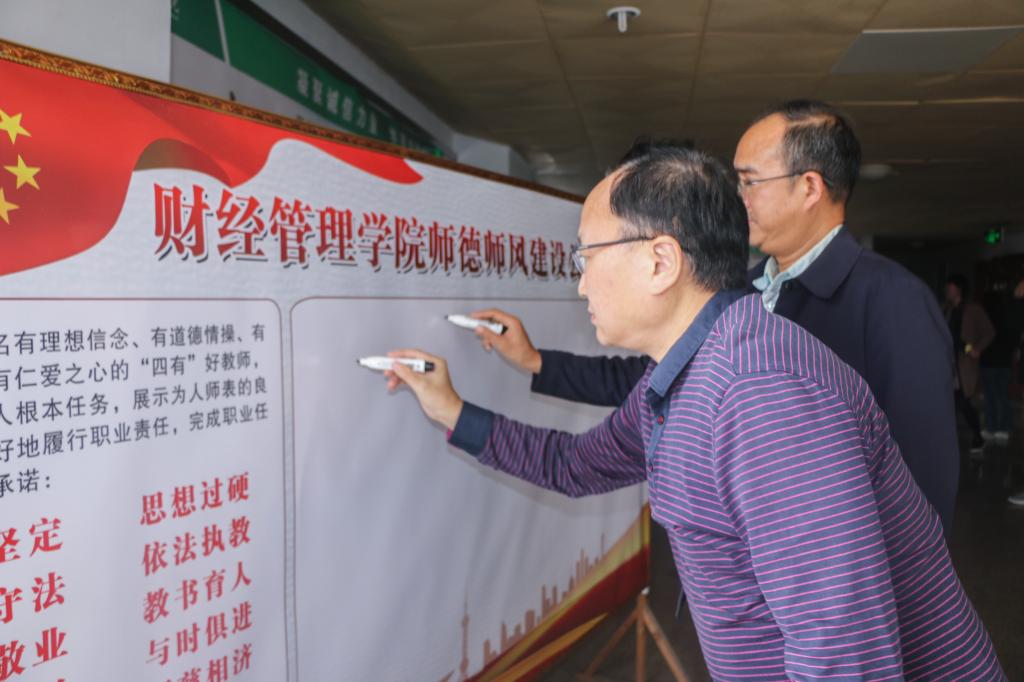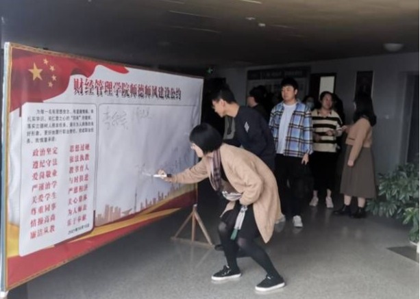 紧接着,党总支书记李兴贵、经理傅忠贤的带领全体教师依次前往师德师风建设签名墙举行了签名活动。