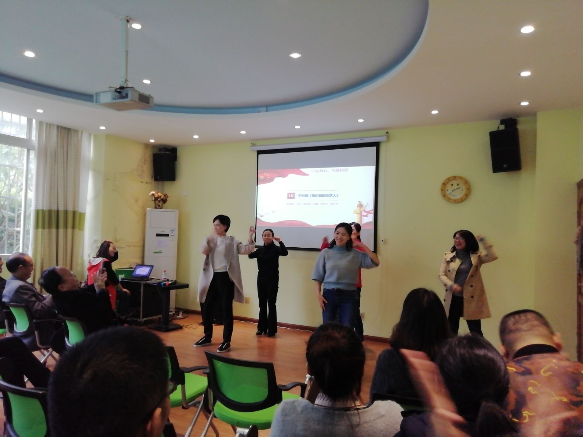 活动伊始,王君老师慷慨激昂的朗诵《我的祖国》奠定了本次活动的基调。随后,梁少林老师歌曲《我爱你中国》激起了全场观众的爱国热情;傅忠贤教授的口琴表演悠扬婉转、余音绕梁,犹如新中国建国以来慢慢发展、悠悠成长的时光;多位老师合作表演的手势舞《我们都是追梦人》带领大家感受了为中国梦而奋斗的日子……本次活动表演主题响亮鲜明、表演形式丰富多彩,表演者笑容满面、激情四射,观众们热情似火,掌声雷动。
