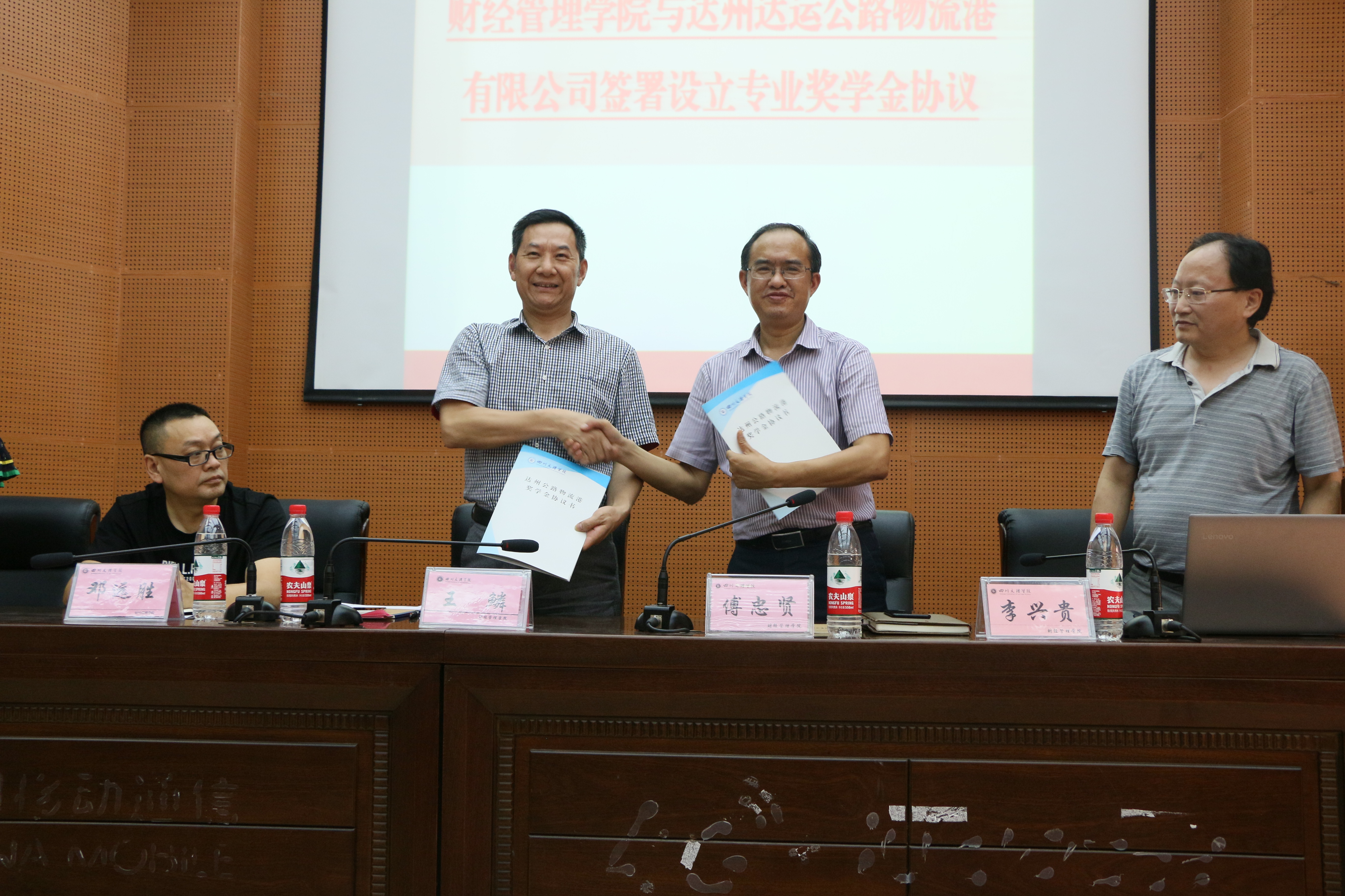 经理傅忠贤教授与达州达运公路物流港有限公司总经理王鳞先生共同签署了设立物流管理专业奖学金协议,此次协议的成功签订标志着公司与达州达运公路物流港有限公司的合作关系迈进了更深入更持久的一大步。