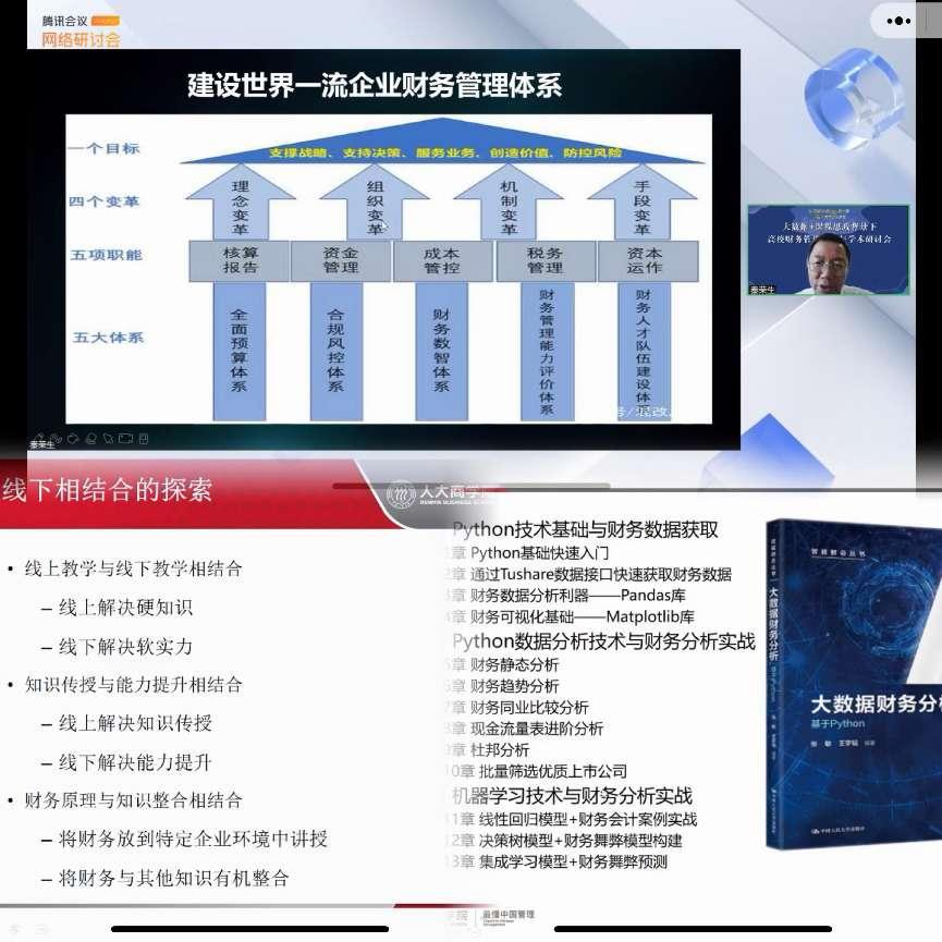 在财务管理研讨会部分,王化成教授结合财务管理学这门课程从什么是好的教学、未来高层次财务管理人员的能力框架、如何在教学中提高员工的创新能力和健全人格四个方面进行交流;秦荣生教授分享了企业数字化转型与世界一流财务管理体系建设相关内容;张敏教授结合大数据财务分析课程对当前智能会计相关课程设置及进行讲解。
