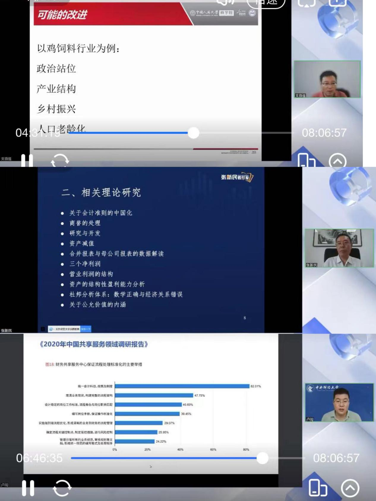 在会计研讨会部分,张新民教授以财务会计和报表分析类课程为例,讲授了课程思政和案例教学的结合,主要从课程思政的基本内容,会计的发展趋势、教材关于课程思政的结构安排、课程思政的核心价值塑造等内容。支晓强教授以管理会计为例,主要围绕激发员工参与培养守正创新人才进行讲授。卢闯教授以大数据和技术变革背景下的会计教学改革—以财务共享和管理会计为例,讲述了未来的财务管理模式,强调了在不断的解决问题中逐渐发展,财务共享中心不是单纯的信息化建设,将涉及到六大改造:观念改造、组织再造、流程再造、核算再造、制度再造和信息系统再造等方面。并对财务共享的课程属性和定位做了重要的论述。