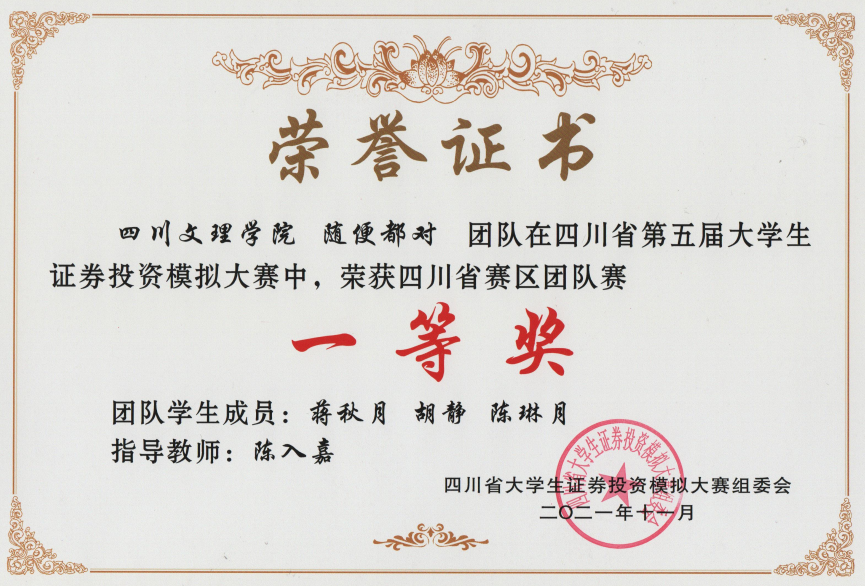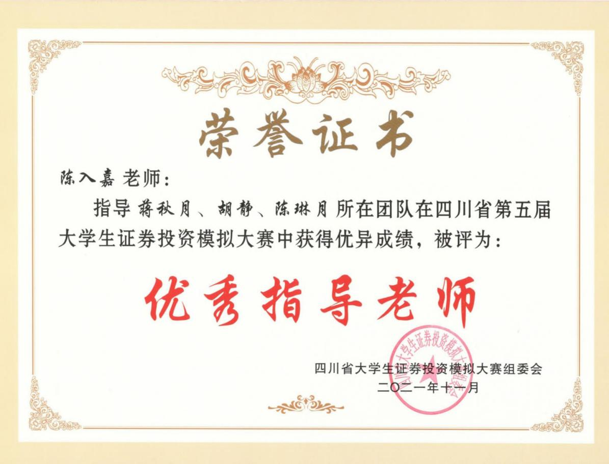 公司财经学子在陈入嘉、苟聪聪、李爱民三位老师的指导下,在全省30多所本科院校的1352支参赛队伍中一路过关斩将,荣获1个一等奖,1个二等奖和3个三等奖,陈入嘉老师荣获“优秀指导老师”。