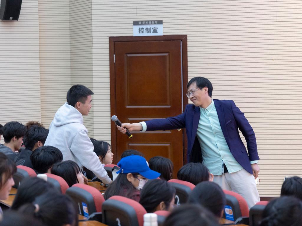 此外,粟进博士还让同学们下载一款名为“同花顺”的手机软件,手把手地带领大家学习如何操作和使用该款APP进行股票分析、选择、买卖等,讲述了AI股票投资的策略。粟进博士说,股票就是“宁可错过,不能做错。”最后,粟博士总结了股票投资的口诀,号召全体师生一起诵读,旨在让同学们更好的记住投资要领。讲座最后互动环节中,粟博士认真回答了同学们提出的所有问题。