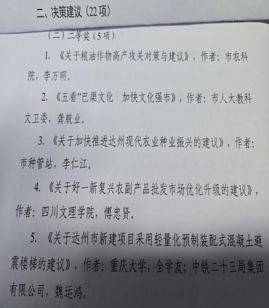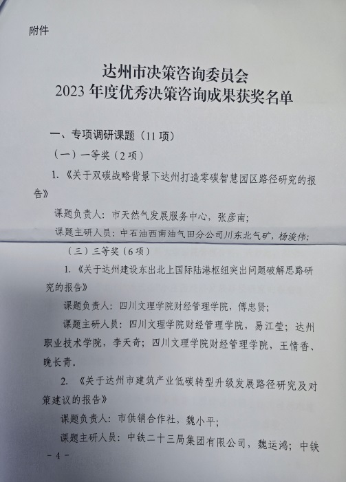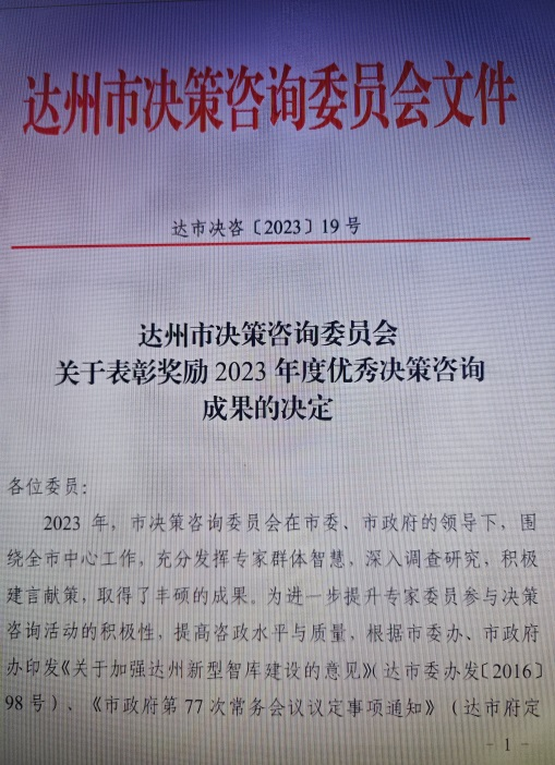 近日,从达州市决策咨询委员会收悉《关于表彰奖励 2023 年度优秀决策咨询成果的决定》,达市决咨〔2023〕19 号,经理傅忠贤教授带领的团队提交的两项研究成果,获得达州市决策咨询委员会奖励。其中《达州建设东出北上国际陆港枢纽突出问题破解思路研究》获2023“专项调研课题”三等奖。《关于好一新复兴农副产品批发市场优化升级的建议》,获2023“决策建议”二等奖。