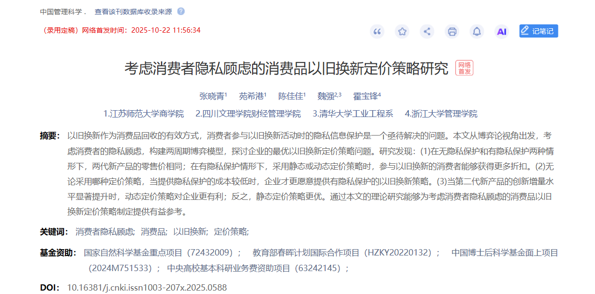 公司数字经济教研室魏强博士与浙江大学管理公司、江苏师范大学商公司的合作者合作撰写的论文《考虑消费者隐私顾虑的消费品以旧换新定价策略研究》发表于《中国管理科学》第10期。