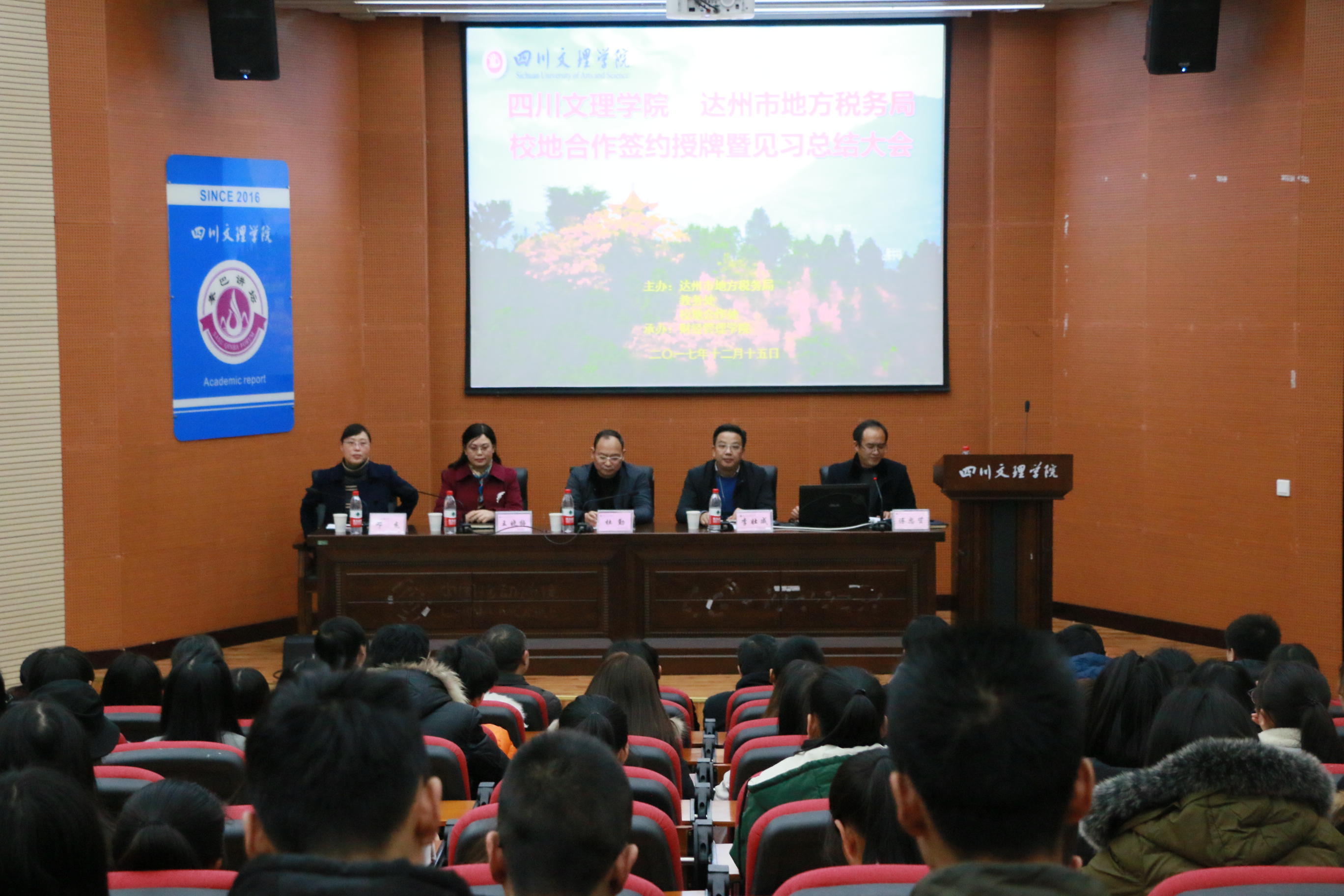 2017年12月15日15:00时,公司与达州市地方税务局在学术报告B厅举行校地合作签约授牌暨专业见习总结大会。出席会议的达州市地税局的领导有:党组书记、局长杜勤,党组成员、总经济师王晓梅,人事科科长陈志刚;出席会议的校内领导有:副董事长李壮成教授,教务处处长邓杰教授,校地合作处公共资源交易服务中心副主任田江。365英国上市集团经理傅忠贤教授、党总支副书记(主持工作)李兴贵、副经理孟秋菊教授、党总支副书记蔡奇航、党政办主任、学工办主任、各教研室主任、专业教师及365英国上市集团部分员工参加了此次见习总结大会。经理傅忠贤教授主持签约授牌仪式,党总支副书记(主持工作)李兴贵主持专业见习总结大会。