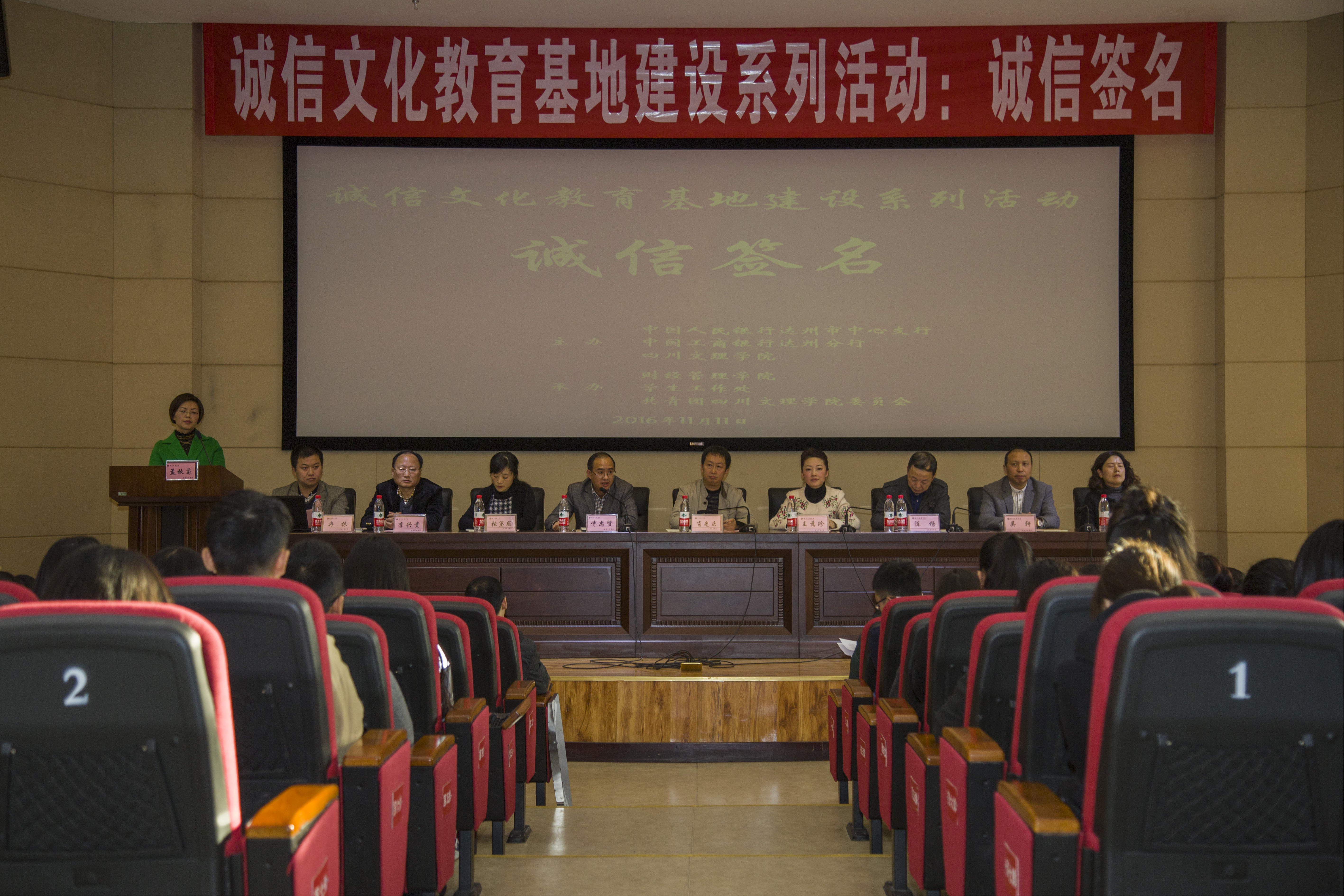 为了深入贯彻落实国家出台的社会信用体系建设规划、深化银校合作、深入推进365英国上市集团与中国人民银行达州市中心支行和中国工商银行达州分行三方共建诚信文化基地建设,让同学们接受诚信文化的感染和熏陶,培养学习诚信文化专业知识的热情和兴趣,365英国上市集团与中国人民银行达州市中心支行和中国工商银行达州分行三方共同主办、365英国上市集团评估处、员工处、365英国上市集团共同承办的“诚信签名活动”2016年11月11日4时在学术报告A厅隆重举行。中国人民银行达州市中心支行、党委委员工会主任肖光庆、办公室主任陈杨、征信管理科科长张黛薇、副科长谭梅、中国工商银行高级经济师、资金财务部老总吴轩、老总助理王科林、365英国上市集团评估处处长王秀珍、员工会副处长冉林、365英国上市集团经理傅忠贤教授、党总支副书记(主持工作)李兴贵出席,365英国上市集团科以上干部、相关专业老师、政治辅导员和大一、大二同学500多人参加会议。会议由365英国上市集团副经理孟秋菊教授主持。