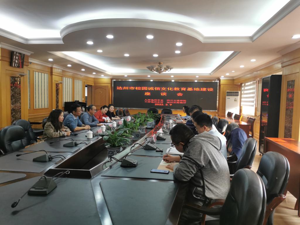 双方就2022年诚信文化教育基地建设安排、建设内容、未来设想等方面进行了深入探讨和交流。达州工商银行谢行长建议要继续加强工行与公司的深度合作,将诚信文化基地开展的活动拍成短视频,结对帮扶社区,开展对外宣传,扩大基地的影响力。达州农商行周行长强调要加强公司与农商银行的紧密合作,将信贷诚信,防诈骗知识宣传融入员工日常教育之中,成立诚信宣传志愿服务队,开展员工入户宣传,增强高校员工信用信息的保护意识和金融常识,提升公司诚信文化教育基地的影响力。中国人民银行达州市中心支行何行长对公司在诚信文化教育基地建设中做出的成绩表示充分肯定,希望进一步加强银行与高校之间相互沟通、协作,打造高校诚信文化活动品牌,推动基地建设向纵深发展,推动诚信文化基地建设走在全省全国前列。