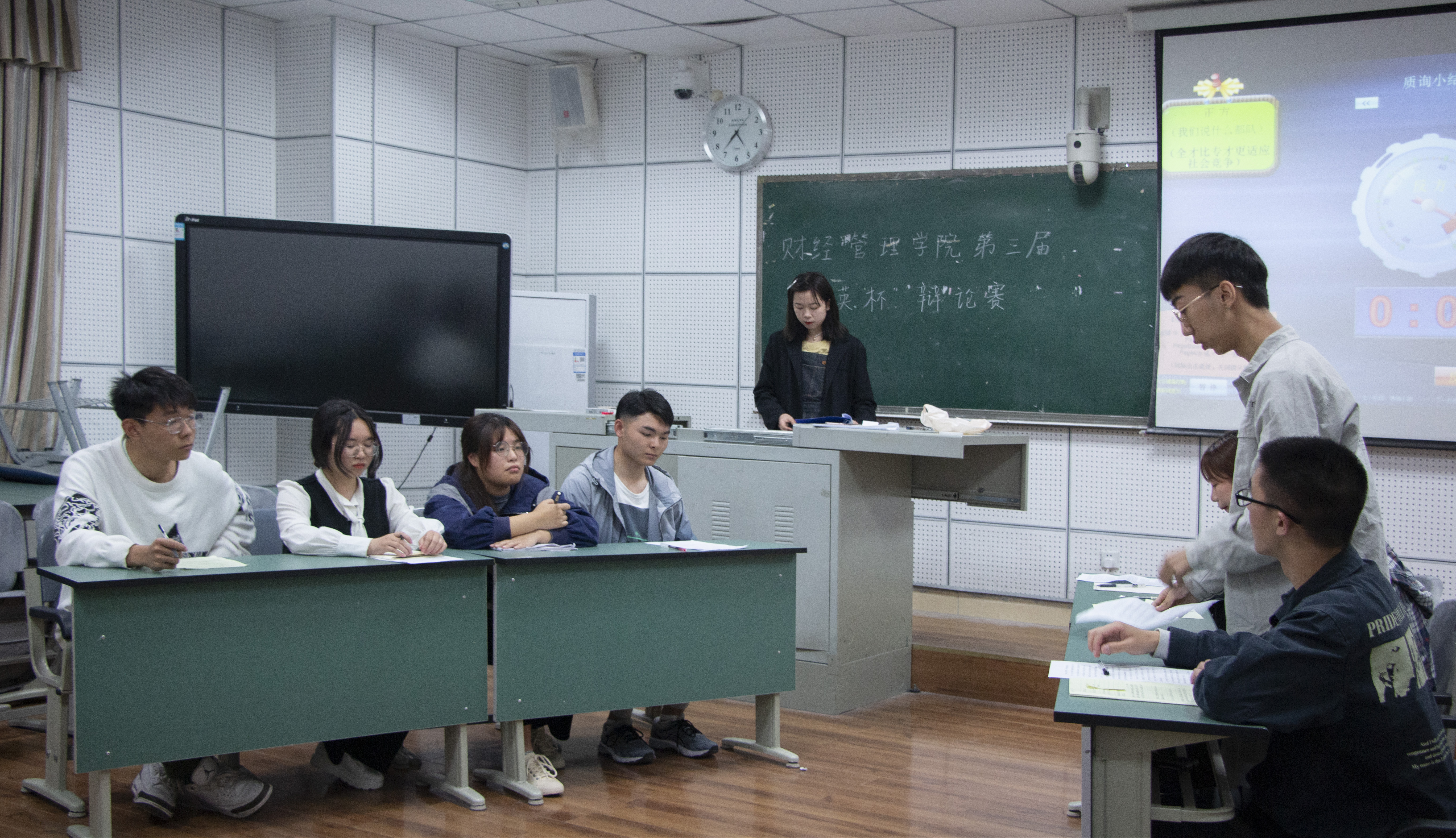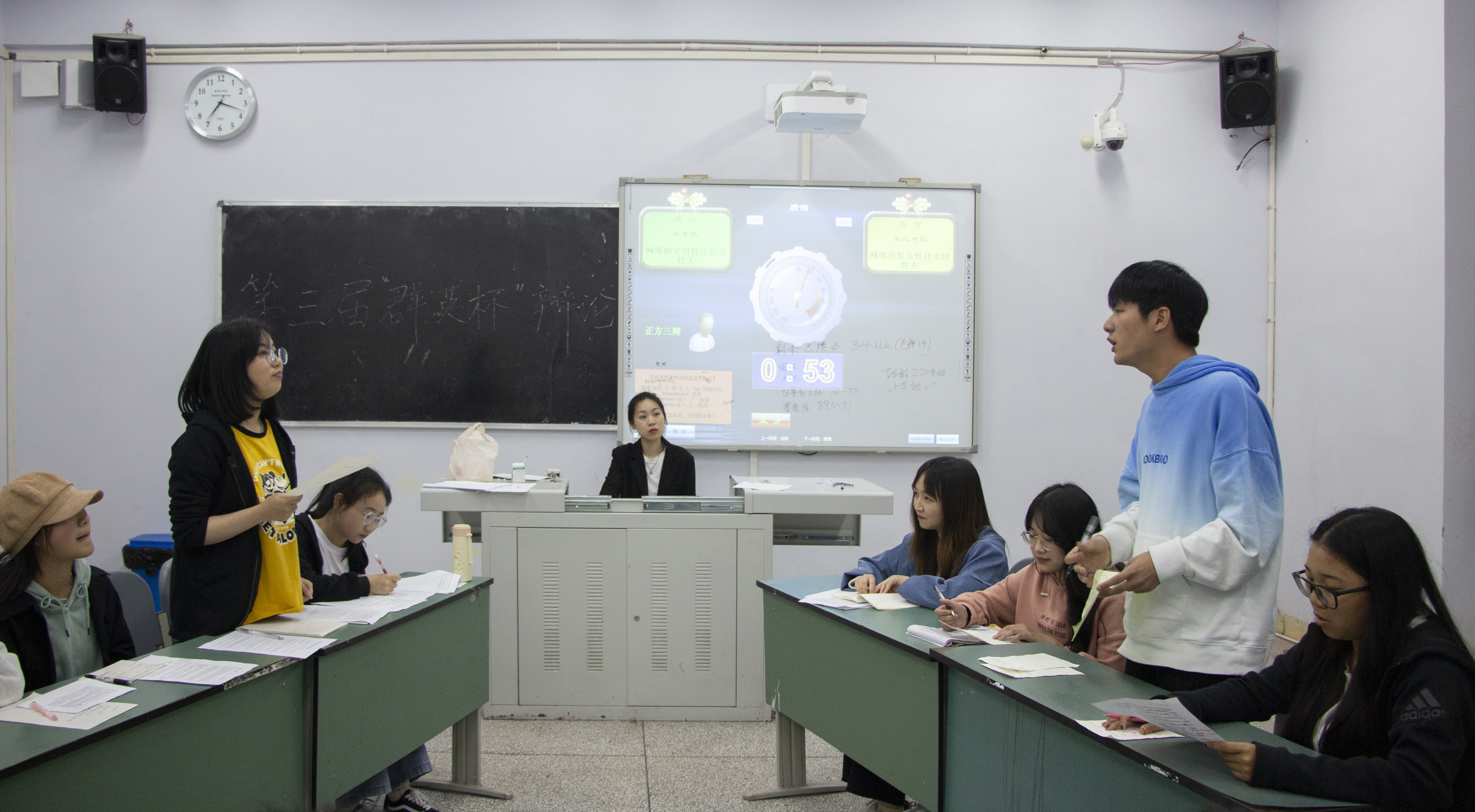 古有卧龙诸葛舌战群儒,今有群英荟萃慷慨陈词。此次辩论地点分为两个教室,共五组选手。无论是哪个“战场”都战况激烈,一辩论点清晰,二、三辩犀利问答,四辩对论点全面总结,一环扣着一环的论点,一个接着一个的问题,给我们带来了极强的感知冲击。双方选手在立论,驳立论,智辩等各个环节中思路清晰,引经据典,字字珠玑,使现场气氛迅速升温。