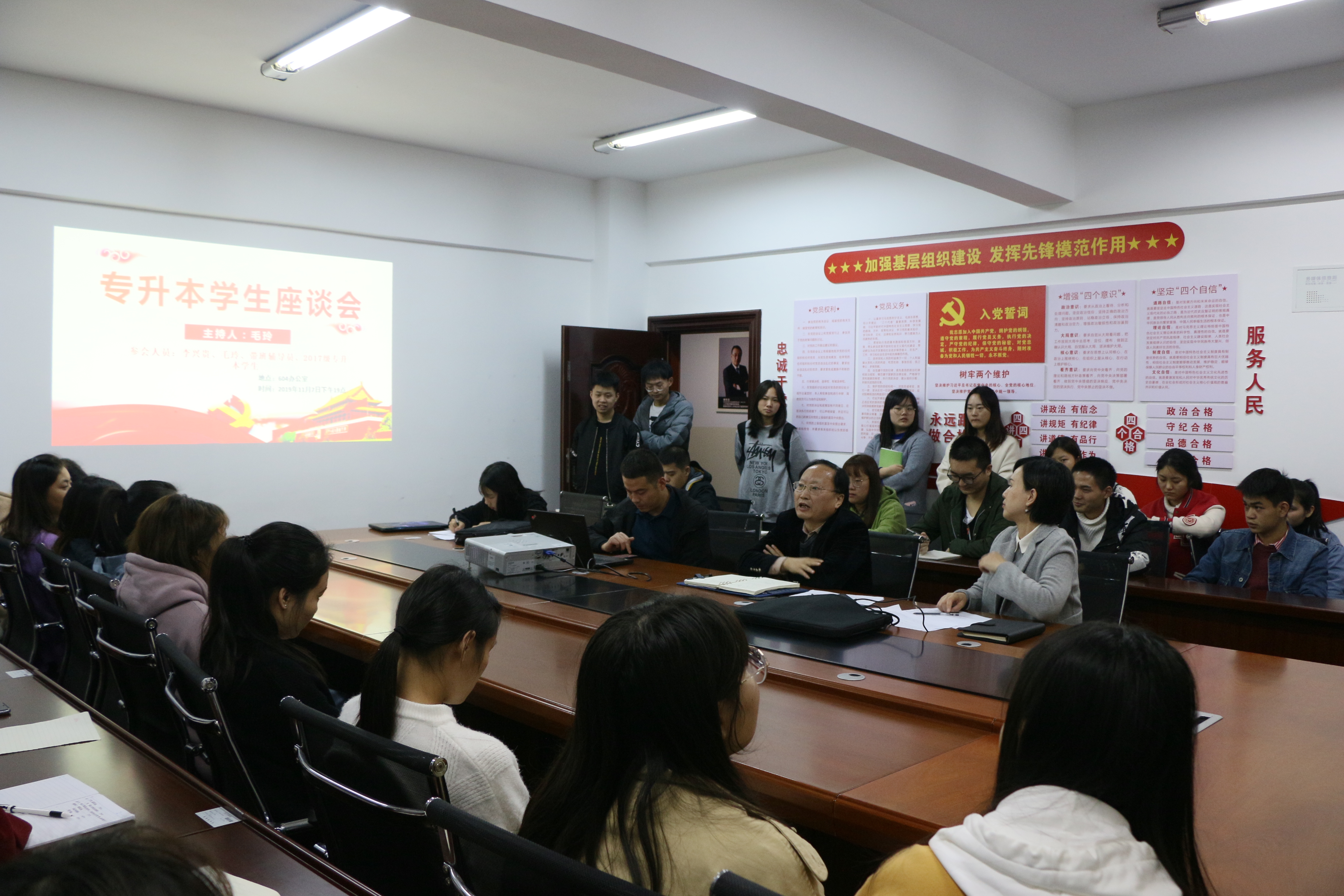 今年秋季开学公司迎来了52位专升本同学,为了深入了解入学以来的学习生活适应情况,提升对专升本同学管理服务的针对性和人性化,2019年11月7日19时整,公司于博文楼604会议室开展了2017届专升本座谈会。参加本场座谈会的领导老师有党总支书记李兴贵、正处级组织员毛玲和辅导员魏晓军,全体2019年秋季入学的52名专升本同学参加了座谈会。座谈会由毛玲老师主持。