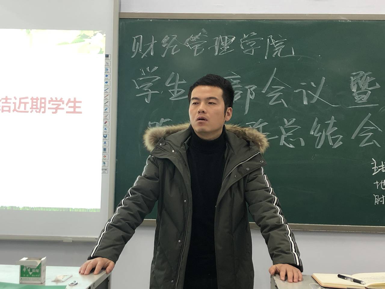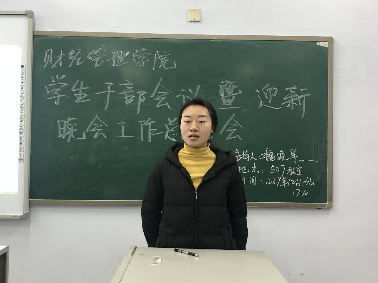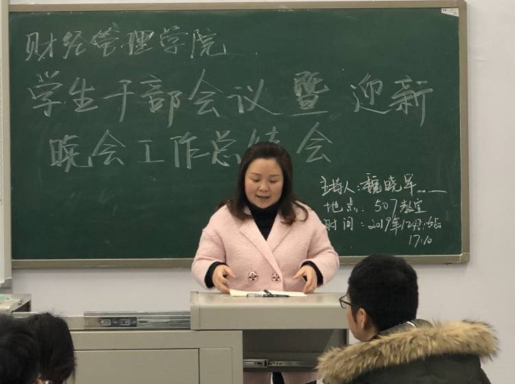 魏晓军老师安排期末团学事宜。魏晓军老师表示本次晚会同学们的表现超出预期;其次,他对负责相关工作的同学提出了要求,要求节目筹备前期确定方向,鼓励同学们进行创新;同时,他表扬了本次的安排与赞助的部分创新,并表示这些创新会将为后续工作打下基础;最后,他表示团学工作应加强规范,希望在周萍书记的带领下同学们鼓足干劲、力争上游。