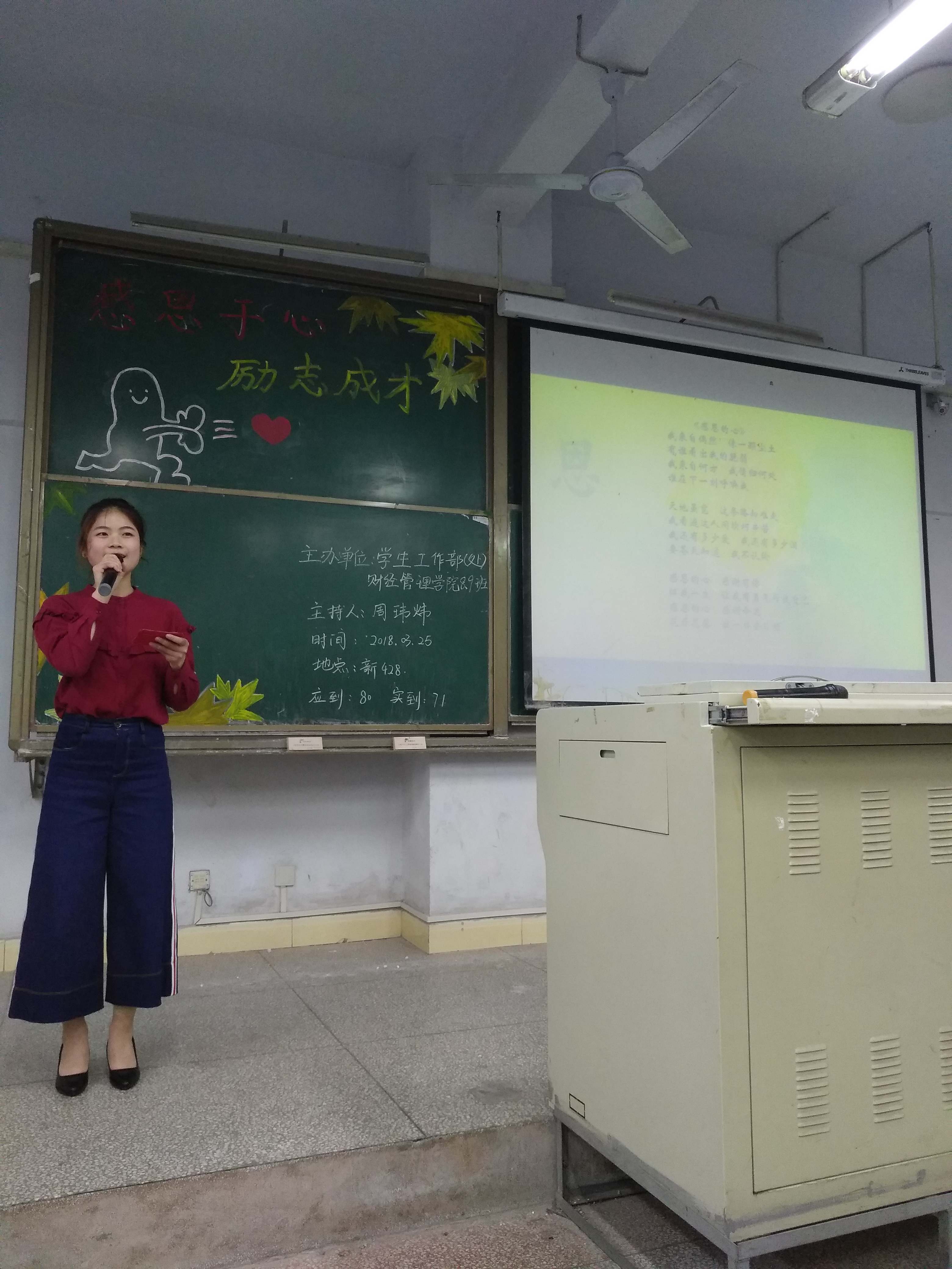 为充分发挥员工资助工作的育人和导向功能,增强受助员工感恩社会的意识和励志成才的决心。2018年3月25日晚上7:00,公司于一教428教室开展了“感恩于心,励志成长“主题班会,辅导员魏晓军、陈欢,班主任代表刘会及公司2017年获得国家奖助学金的同学参加此次班会。