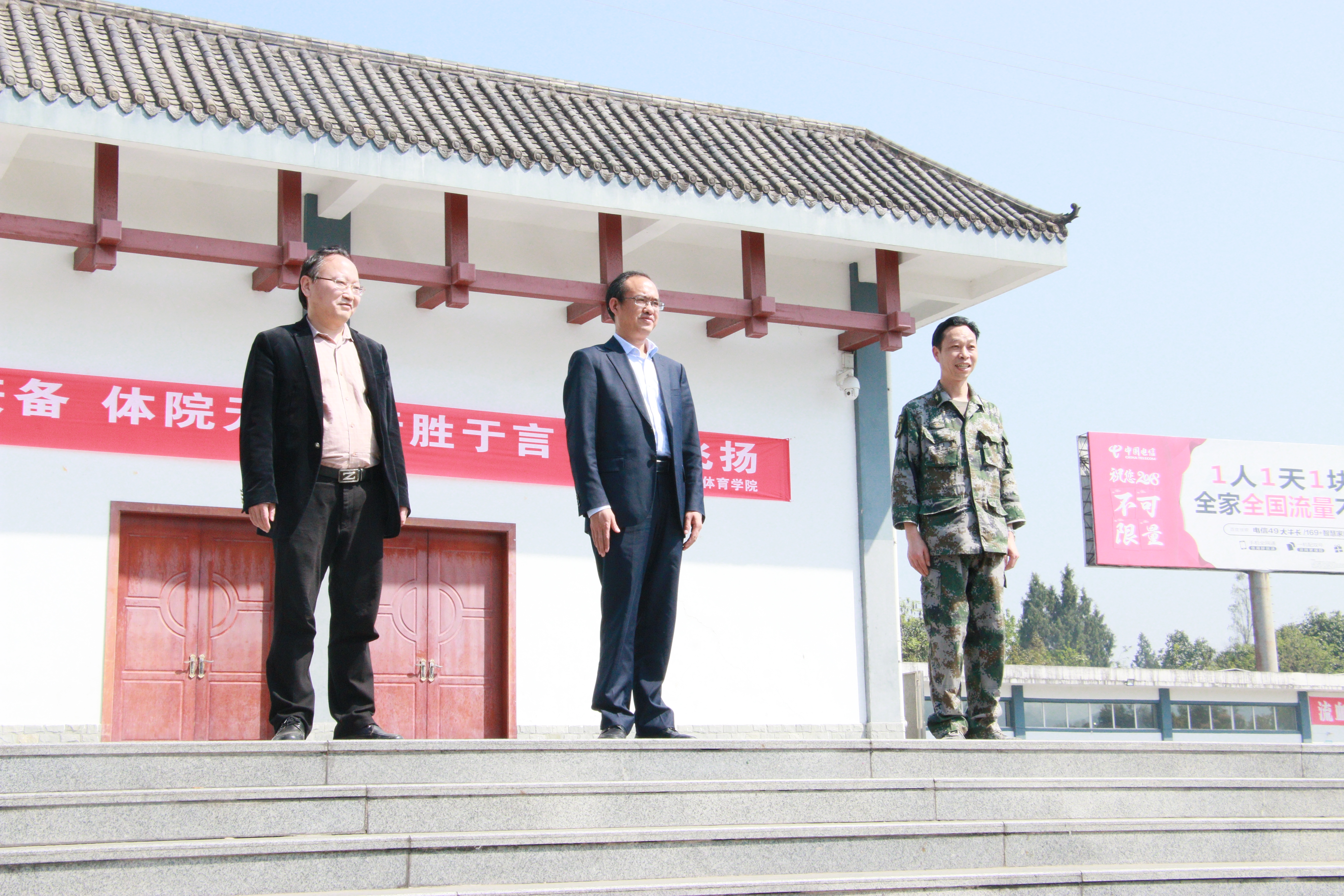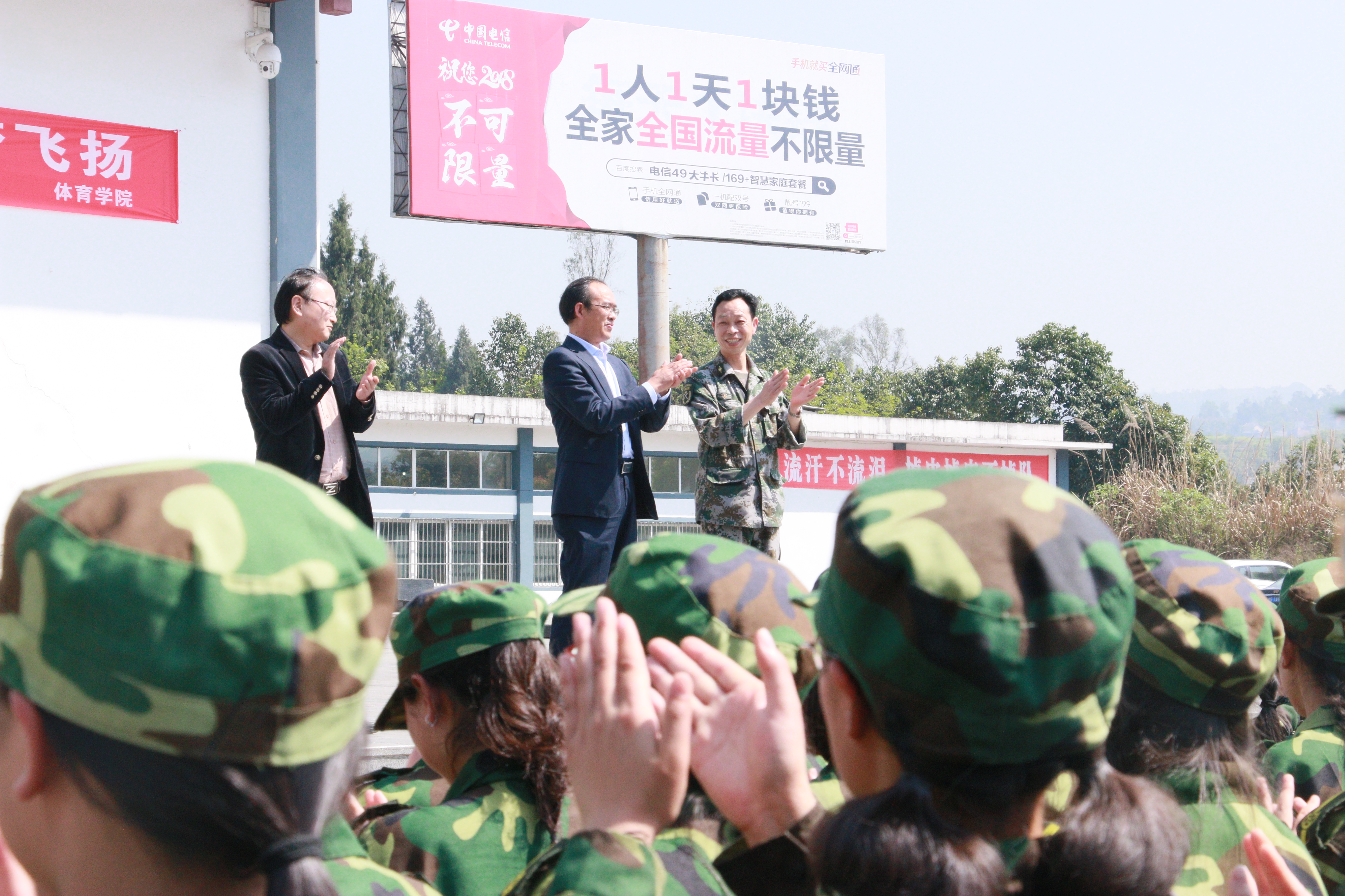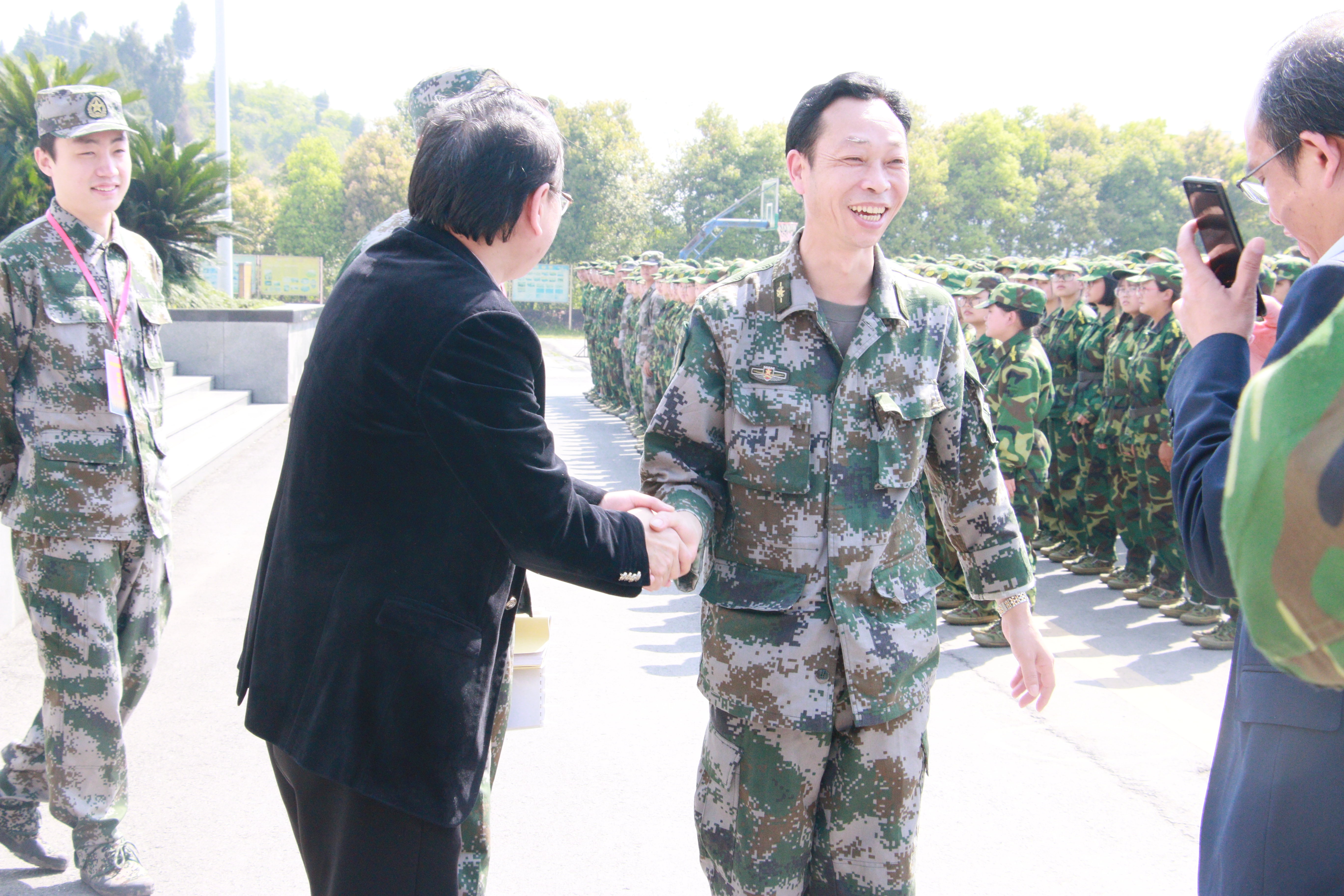 4月2日上午,公司经理傅忠贤、党总支副书记李兴贵(支持工作)、党政办主任程子彪、学工办主任黄文曦及辅导员陈欢一行五人满载的礼品来到达州市国防教育训练基地深情慰问2017级军训新生及教官。