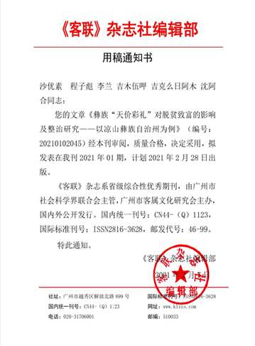 受社团良好氛围的影响,社团成员一路前行自我提升,在各项比赛中大放异彩,其中新起点科研社团副会长沙优素同学带领的团队在程子彪副教授的指导下,撰写的题为《彝族“天价彩礼”对脱贫致富的影响及整治研究——以凉山彝族自治州为例》的论文引起较为广泛的关注。