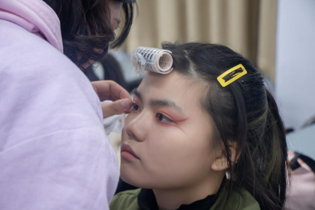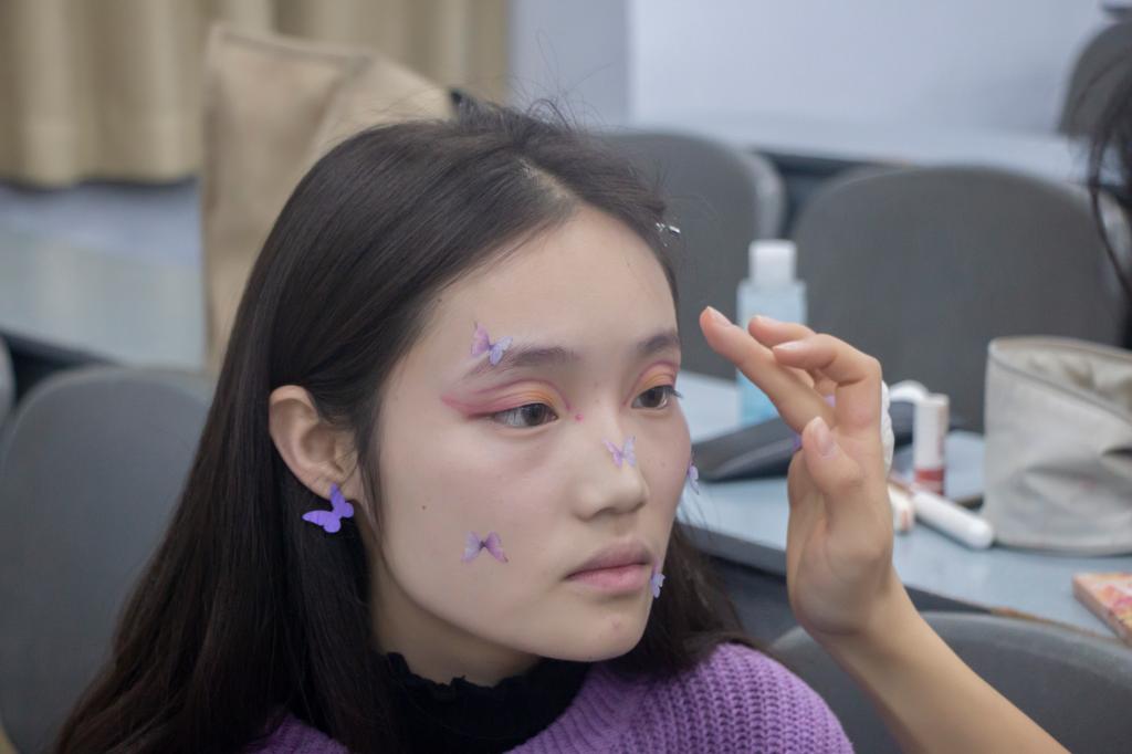 主持人对此次比赛规则进行了简要介绍和说明,比赛进入正式环节。参赛选手带着她们的模特有序进场,摆放好化妆品,模特们静坐一旁,参赛选手们有条不紊地为自己的模特上妆,她们细致地为模特们描眉、点唇、打腮红,在脸上慢慢晕染。模特的妆容与服装相搭配,有以紫色为主的《紫色蝴蝶》,还有象征好运的《西红柿》装扮等。评委们看着心灵手巧的选手们,纷纷点头以示赞赏。不知不觉间,比赛已近尾声,环顾四周,模特们精致的妆容彰显着她们的个性。随着主持人宣布比赛结束,选手们带着盛装的模特上台展示,并介绍了她们妆容的名字、含义、象征,为在场观众带来了一场视觉盛宴。经评委公正评判,最后评选出了一等奖,二等奖,三等奖以及优秀奖。