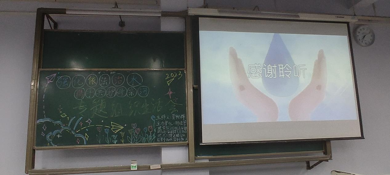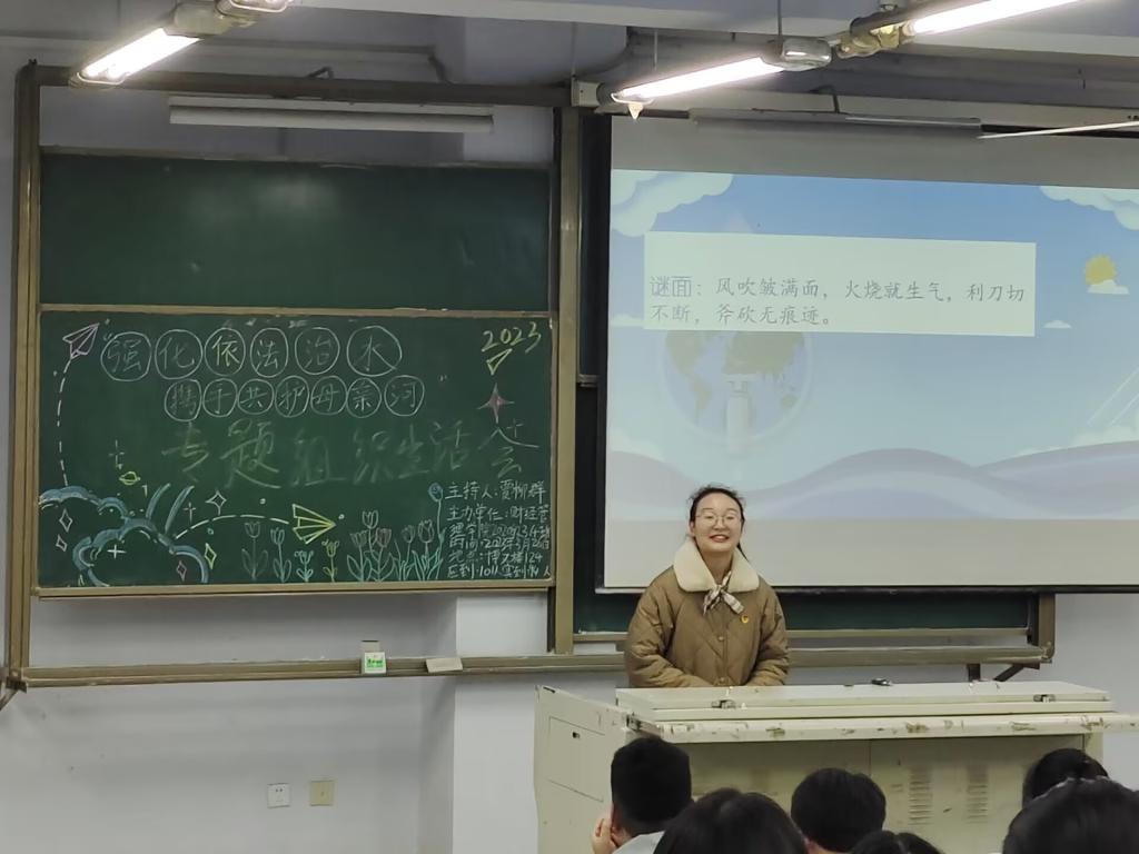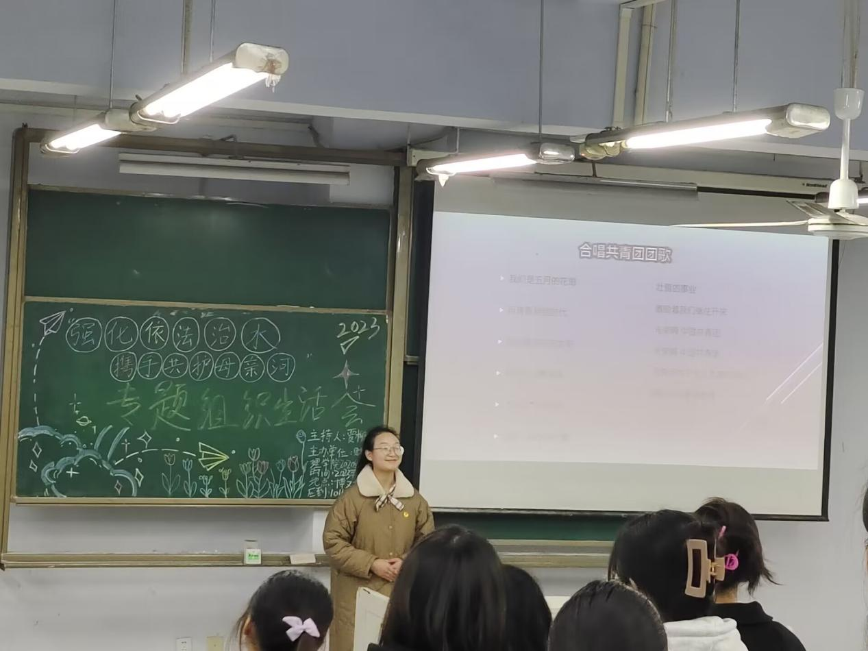 本次团会首先由2020级4班贾柳群同学带领同学们合唱团歌,然后贾柳群同学用一个谜语带动班级同学的热情,塑造了有利于宣传用水法治和绿色发展理念的氛围。