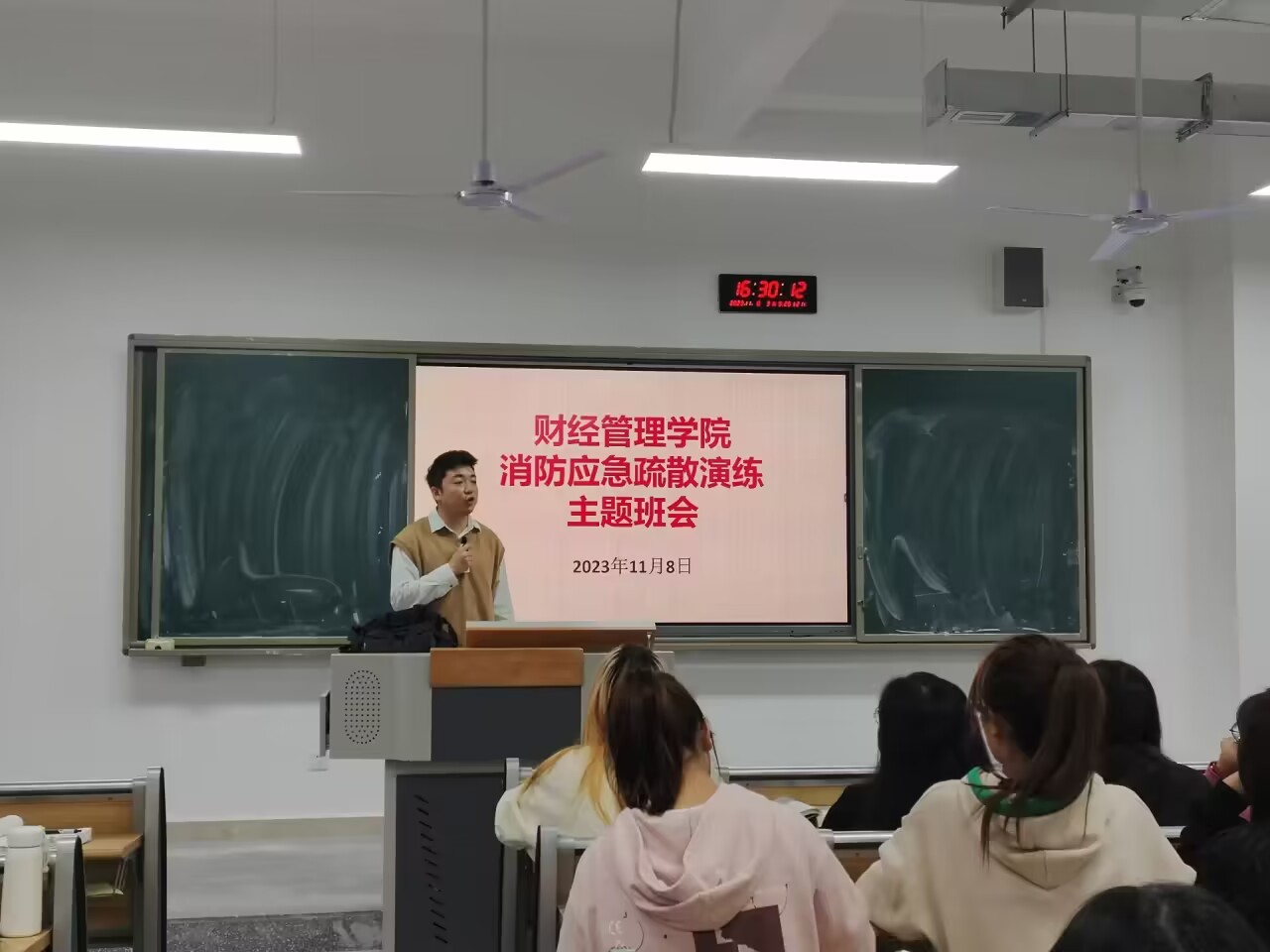 结合我院实际情况,公司各班于11月8日,在东区C教各教室召开消防应急疏散演练主题班会,此次班会由各带班辅导员组织员工开展。