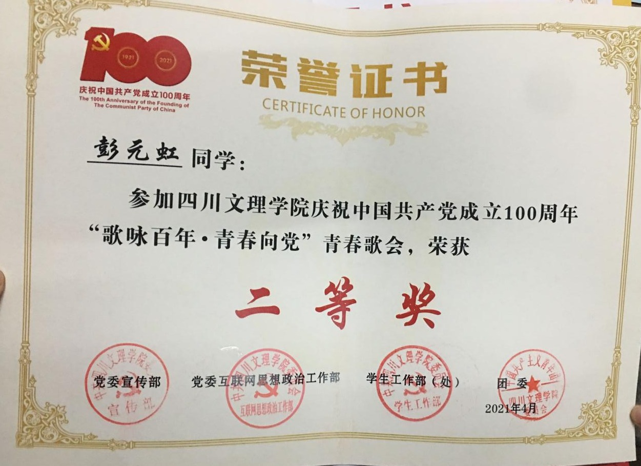 世间万事,最怕“用心”二字;方向正确的事,就尽心尽力去完成,才能不断提高自己的能力,注重细节,把一件又一件的小事做好,才能慢慢垒起万丈高楼。在担任员工干部期间,彭元虹认真对待工作,尽心尽力把自己的事情做好,无论是社团承接学科竞赛,还是在日常员工工作里,她都一丝不苟、兢兢业业,将具体事项协调地有条不紊,帮助一项项学科竞赛落稳落实。在2020年度,她被公司评为“优秀共青团干部”、2020级员工“军训优秀学员”,她致力于志愿服务活动‘主动承担社会责任,在2021年暑期“三下乡”社会实践活动中被评为“社会实践先进个人”,并在“歌咏百年 青春向党”青春歌会中荣获二等奖。