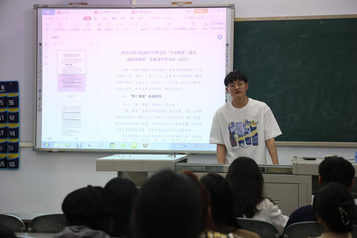 本次宣讲会分三个流程,首先邀请团总支副书记杜何飞就第二课堂学分制度做详细讲解,在讲解中,转专业同学清楚明白地了解了本院的第二课堂认证流程及其相关要求,减少了同学们对本公司第二课堂学分制度的困惑和疑问,加深了同学们的了解和认识。