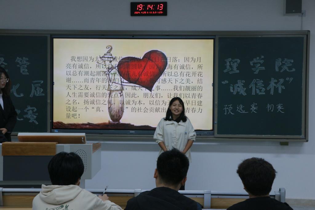 为进一步弘扬诚信之风,营造良好的文明氛围,4月29日晚上七点,公司第六届“诚信杯”演讲比赛预选赛初赛于东区B101、B102、B103、B104教室如期举行,A、B、C、D四个赛场同时展开激烈的比拼。演辩部、青协、文艺部干事同学担任各赛场主持人。
