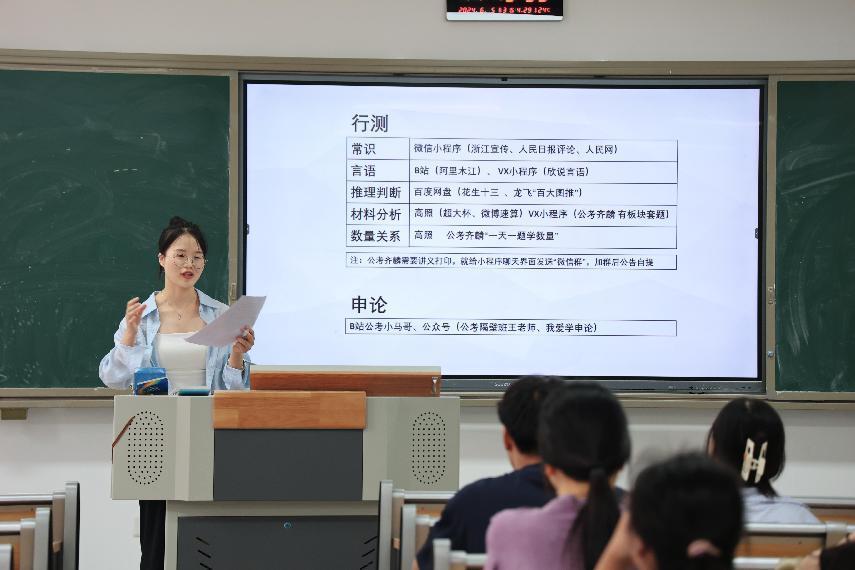 其次由考公上岸的学姐分享心得。省考上岸的郭庆丹师姐对自己的备考经验,详细讲解了公务员考试的题型和难点,分享了备考过程中如何提高答题速度和准确率的技巧。