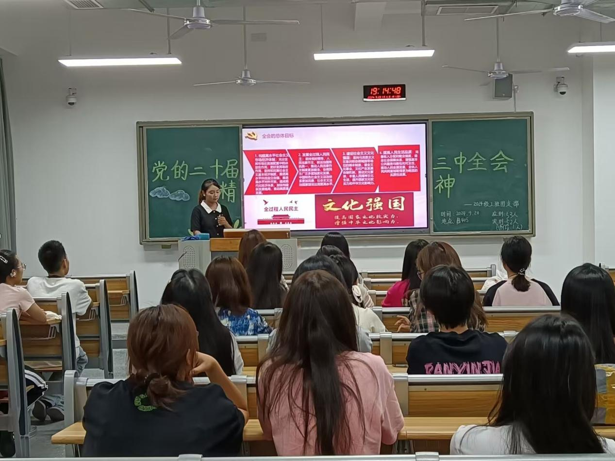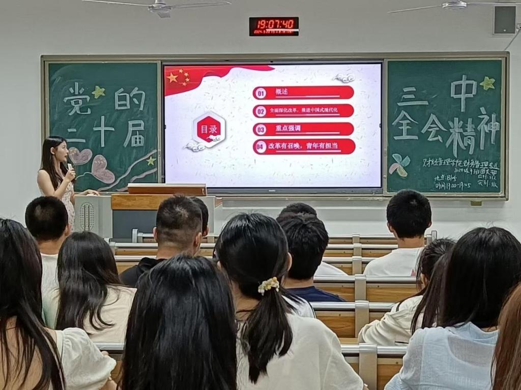 活动伊始,全体齐唱团歌,团支书领学《中共中央关于进一步全面深化改革、推进中国式现代化的决定》主要内容,带领同学们回顾改革开放以来的历届三中全会以及二十届三中全会概况,让大家准确理解进一步全面深化改革重大举措,深刻认识进一步全面深化改革的重要性和必要性。随后,在互动环节中,同学们积极参与,分享自己对于党的二十届三中全会精神的认识与理解。