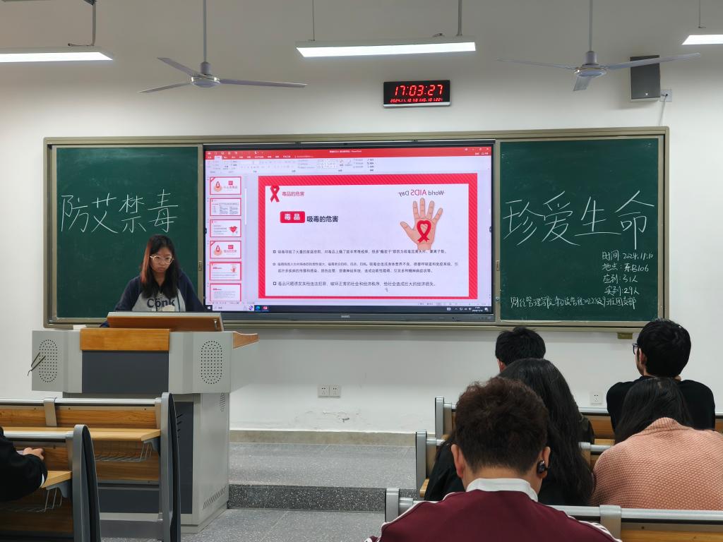 在本次主题团日活动中,各团支部认真组织策划,活动内容丰富。活动初始,全体成员齐唱团歌。在团支书的带领下,同学们共同学习了艾滋病和毒品相关的基本知识。通过视频观看、案例学习,大家深刻认识到艾滋病传播的迅猛趋势以及毒品对个人、家庭和社会造成的毁灭性打击。互动环节中,同学们围绕如何在生活中抵制毒品和预防艾滋病展开了激烈讨论,纷纷表示在面对毒品诱惑时,要展现坚决拒绝的态度和智慧,使防范知识真正内化为行动能力。