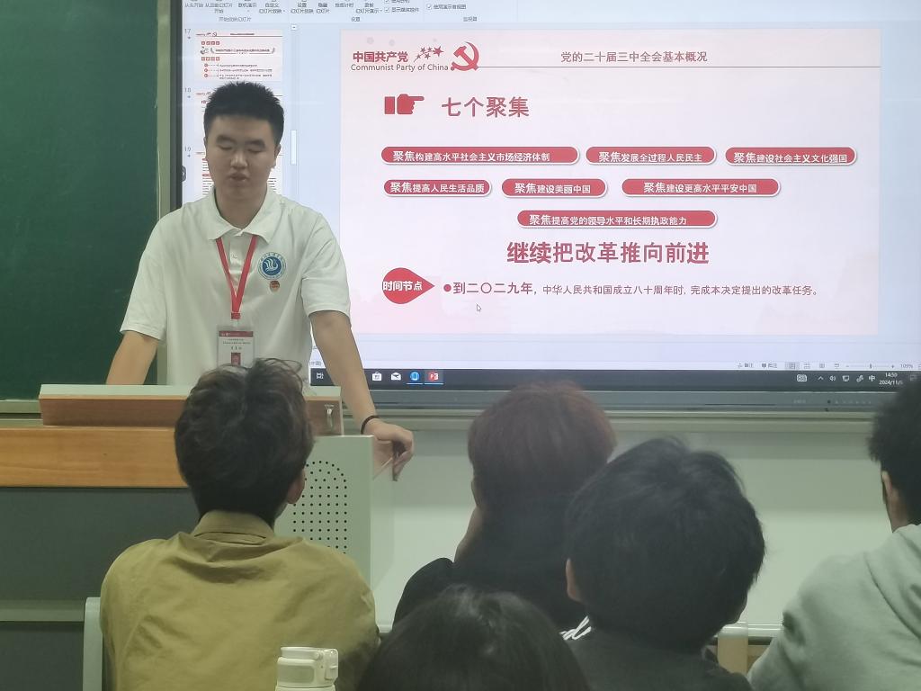 宣讲中,王元昊首先带领在场同学回顾了党的十一届三中全会和十八届三中全会的重大历史意义。随后,他详细阐述了党的二十届三中全会的主要内容和会议精神,强调了青年在国家发展中的重要角色,引用习近平总书记的讲话,激励在场同学要扛起青春责任,在攀登知识高峰中追求卓越,在肩负时代重任时行胜于言,为实现中华民族伟大复兴的中国梦贡献力量。