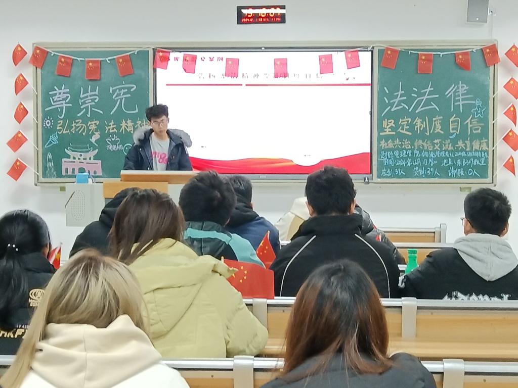 本次团日活动由各班团支书主持,通过PPT演示、案例分析、小组讨论等形式,带领同学们深入学习宪法的历史渊源、核心内容与重要性,引导同学们深刻理解宪法精神与国家制度的内涵与意义。在团课中,团支书详细讲解了宪法作为国家根本大法在保障公民权利、规范国家权力运行方面的关键作用,并结合实际案例,阐述了宪法在日常生活中的具体体现,同学们认真聆听,积极思考。在知识问答环节中,大家踊跃参与,现场气氛热烈,进一步巩固了所学知识。在接下来的小组讨论环节中,同学们各抒己见,从不同角度分享了对宪法精神和制度自信的理解与感悟,在交流中深化认识。