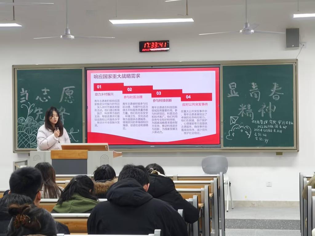 在本次团日活动中,各团支部积极响应要求,精心准备。在活动筹备阶段,各团支部充分发挥主观能动性,围绕活动主题进行策划与布置,为活动的顺利开展奠定了坚实基础。各团支部充分利用PPT演示、案例讲解、视频播放等多种形式,带领同学们深入了解基层工作的重要性与必要性。同时,结合实际情况,引导同学们从基层中学习,感受基层工作的艰辛与收获。活动临近尾声时,团员们积极发言,分享自己对于未来发展的规划,以及如何积极参与志愿服务活动、提高观察力与实践能力的看法。大家纷纷表示,要勇担时代重任,积极为同学做实事、为需要的人做实事,以更好的状态去创造有爱的校园环境。