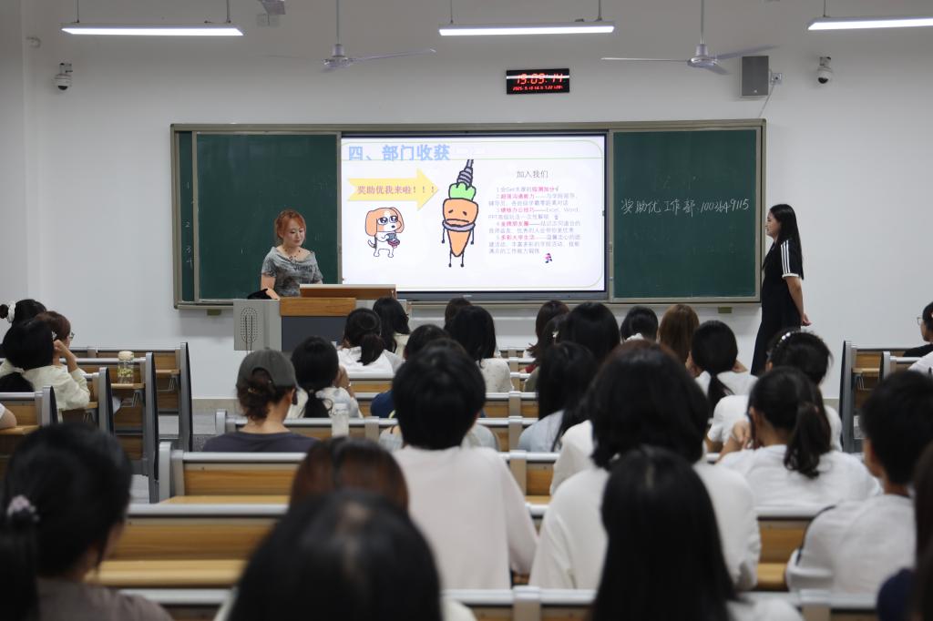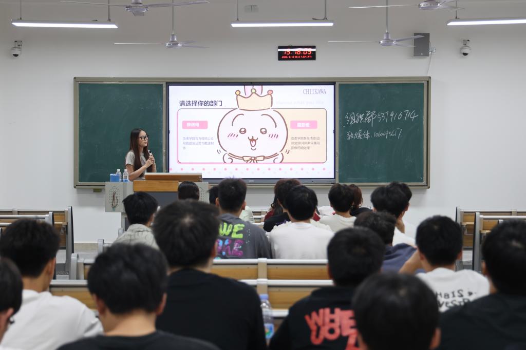 宣讲会上,各部门负责人依次登台开展宣讲。他们精心筹备,创新运用趣味短视频、图文并茂的PPT等多元形式,将部门的核心职能、日常运作、品牌活动及团队风采生动直观地呈现在新生面前,既增强了宣讲的吸引力与感染力,更使让新生们对各部门的工作有了清晰且深入的理解。现场气氛热烈,不时响起阵阵掌声,互动氛围十分活跃。