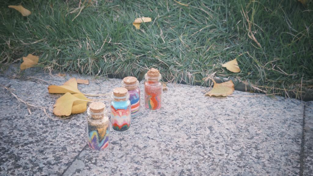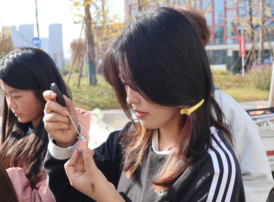 在彩砂瓶创作区,色彩斑斓的彩砂与透明的玻璃瓶相映成趣。同学们精心挑选心仪的颜色,将彩砂逐层填充入瓶,悉心塑造成各种形态。这一过程不仅是艺术的创作,更成为情绪表达与内心梳理的安静时光。大家全神贯注于手中的作品,将当下的思绪、内心的憧憬或人生感悟无声地融入这方寸瓶器之中。作品完成后,同学们还在配套的贺卡上认真写下心愿与寄语,让每一个独一无二的彩砂瓶,化作承载美好期许的专属纪念品。
