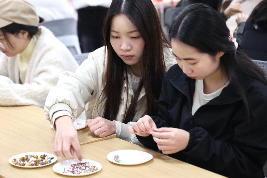 在“DIY手串创作”区,同学们充分发挥想象力与创造力,从琳琅满目的配饰中自主挑选、设计并亲手串制独一无二的手串。整个过程中,大家全神贯注于指尖的精细操作,暂时忘却了学业的压力与生活的纷扰,在宁静的手工时光里获得了有效的放松与减压。最终完成的一件件精美手串,不仅是创意的结晶,更成为了这段愉悦体验的专属纪念品。