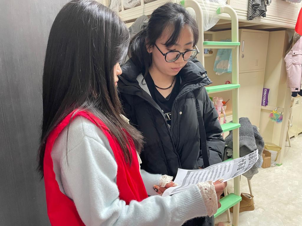 寝室是同学们在校的“家”,其安全直接关系到每个人的切身利益。干事们转变角色,以“服务者”和“贴心人”的身份,主动敲门、走进寝室,倾听同学们在寝室生活中遇到的实际困惑与潜在担忧。宣传内容紧扣同学们最日常、也最容易忽视的安全细节,用“拉家常”的方式讲解,让安全知识听得懂、记得住、用得上。