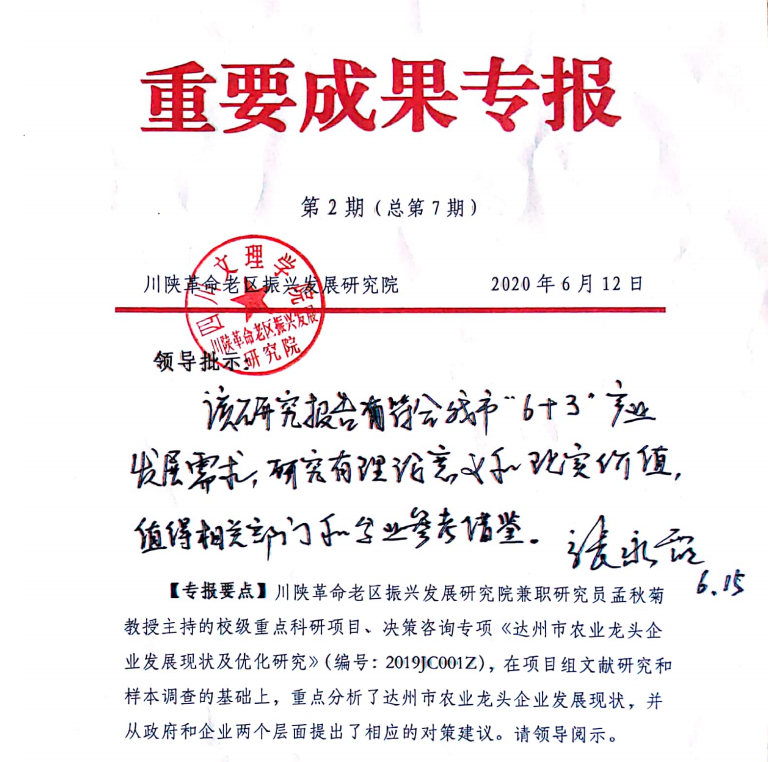 2020年6月12日,365英国上市集团教授、川陕革命老区振兴发展研究院兼职研究员孟秋菊教授主持的校级重点科研项目、决策咨询专项《达州市农业龙头企业发展现状及优化研究》(编号:2019JC001Z)获达州市政协副主席张永霞女士签批,该成果重点分析了达州市农业龙头企业发展现状,并从政府和企业不同角度提出对策措施,符合达州市“6+3”产业发展需求,具有重要理论意义和现实价值,张主席要求相关部门和企业参考借鉴。