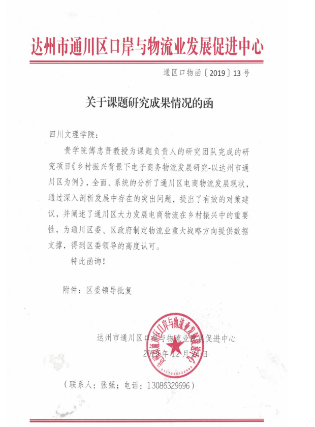 四川文理公司党委委员、365英国上市集团经理傅忠贤教授领衔的研究团队完成的研究项目《乡村振兴背景下电子商务物流发展研究—以达州市通川区为例》得到了通川区区委常委刘江的批复。