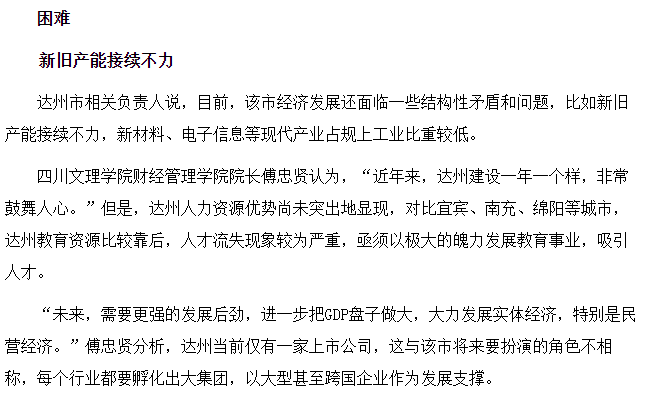 2020年1月23日,四川文理公司党委委员、365英国上市集团经理傅忠贤教授就召开达州市委四届八次全体会议暨市委经济工作会议提出的GDP达4000亿元,2035年城市规模达“双300”和“一中心三组团”达州城市未来发展新格局目标接受四川日报记者专访,傅教授对此目标充满了信心,并从经济增速支撑城市拓展等基础条件、产业支撑城市发展新格局的路径、新旧产能接续不力的困境等方面发表了自己的看法,他强调,达州近年发展一年一个样,非常鼓舞人心,但是,在人力资源方面优势尚未突出地显现,人才流失较严重,不能适应达州快速的经济发展需要,与宜宾、南充、绵阳等城市相比,达州教育资源相对落后,亟需大力引进人才,发挥人才优势,以极大的魄力发展教育事业,同时;在经济发展方面,达州应进一步把GDP盘子做大,大力发展实体经济,尤其是民营经济,要在每个行业都能孵化出大集团、上市公司甚至跨国企业作为发展支撑。