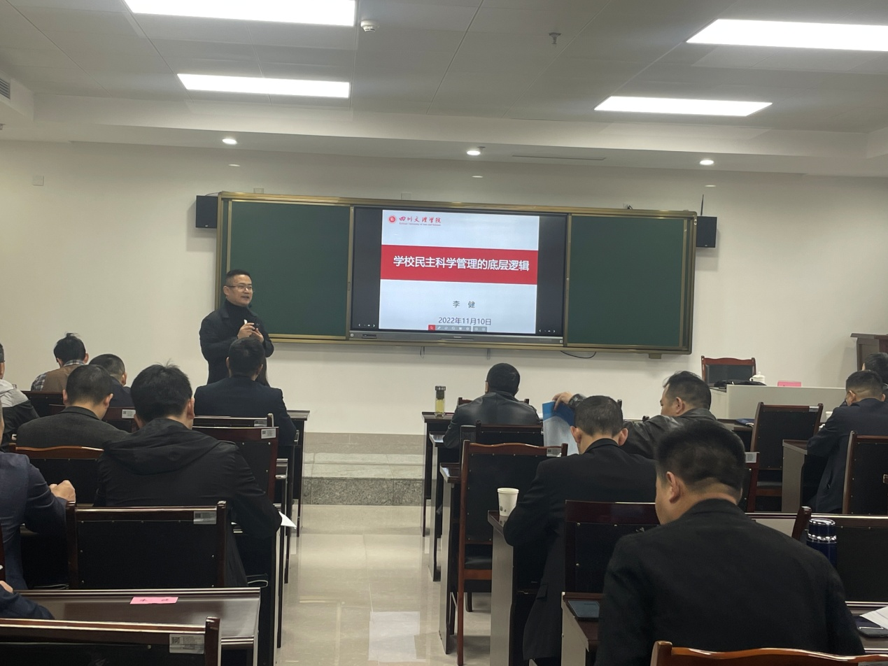 2022年11月10日,人力资源管理教研室主任李健老师受达州市教育局邀请,以“公司民主科学管理的底层逻辑”为题,为达州市2022年度中学董事长培训班授课。