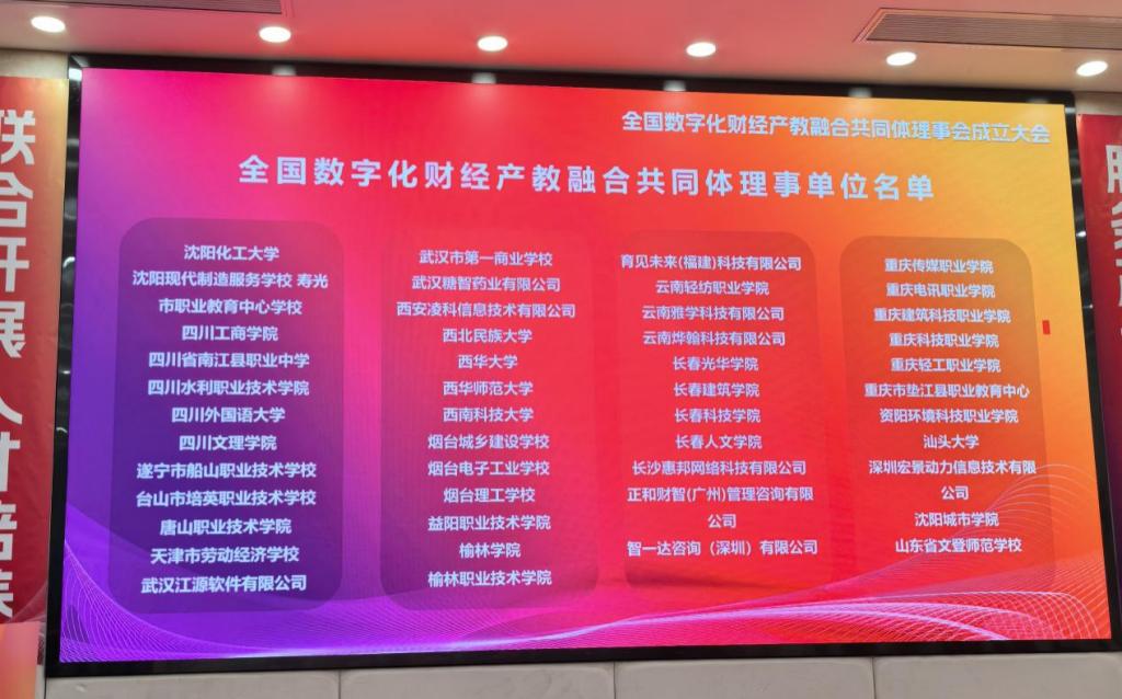 为深入贯彻党的二十大精神,落实中共中央办公厅、国务院办公厅《关于推动现代职业教育高质量发展的意见》《关于深化现代职业教育体系建设改革的意见》文件精神,2023年10月20日在四川财经职业公司召开全国数字化财经产教融合共同体成立大会暨第一届理事会(以下简称“共同体”),共同体是在四川省教育厅、中国商业会计学会的支持下,由西南财经大学、四川财经职业公司、金蝶软件(中国)有限公司牵头,230多家高校、科研机构、企业等单位共同组成。公司经理傅忠贤教授带队前往参会,公司成为共同体理事单位。