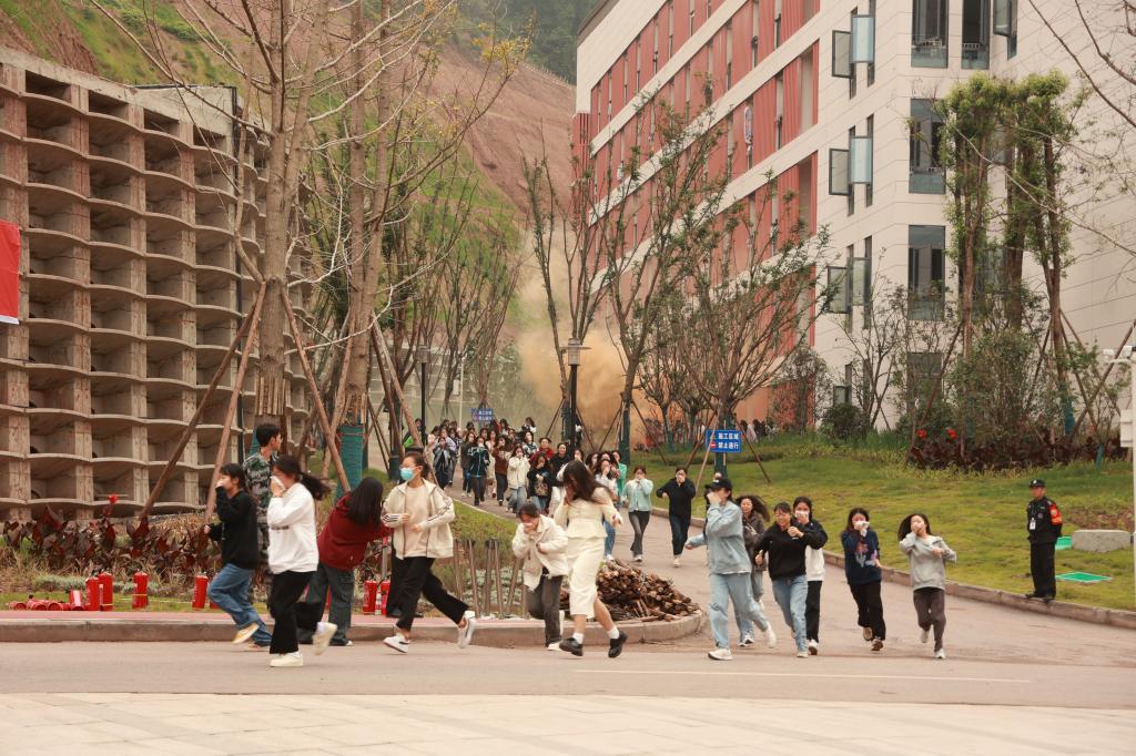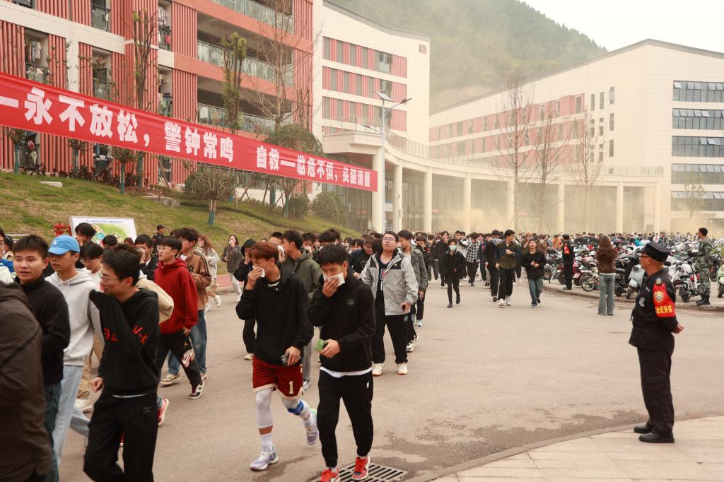 为模拟更为真实的火灾情景,达州市消防救援支队在现场投放了烟雾弹,并协助带班辅导员、宿管阿姨们在各个楼道口和宿舍出口引导员工安全撤离。同时,为了提高师生及东区员工掌握消防器材的使用能力,现场采用油盆模拟起火,参训人员轮流使用干粉灭火器扑灭初起火灾。