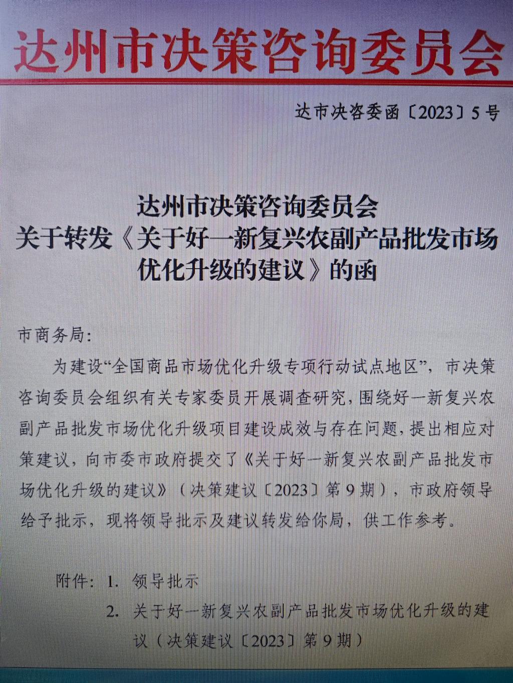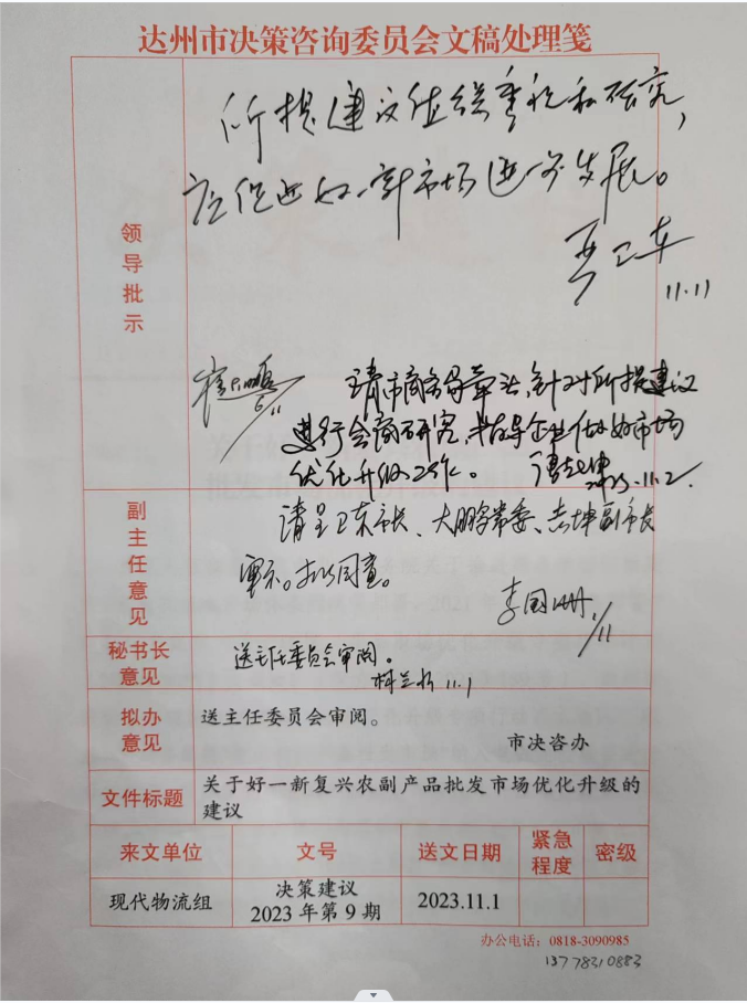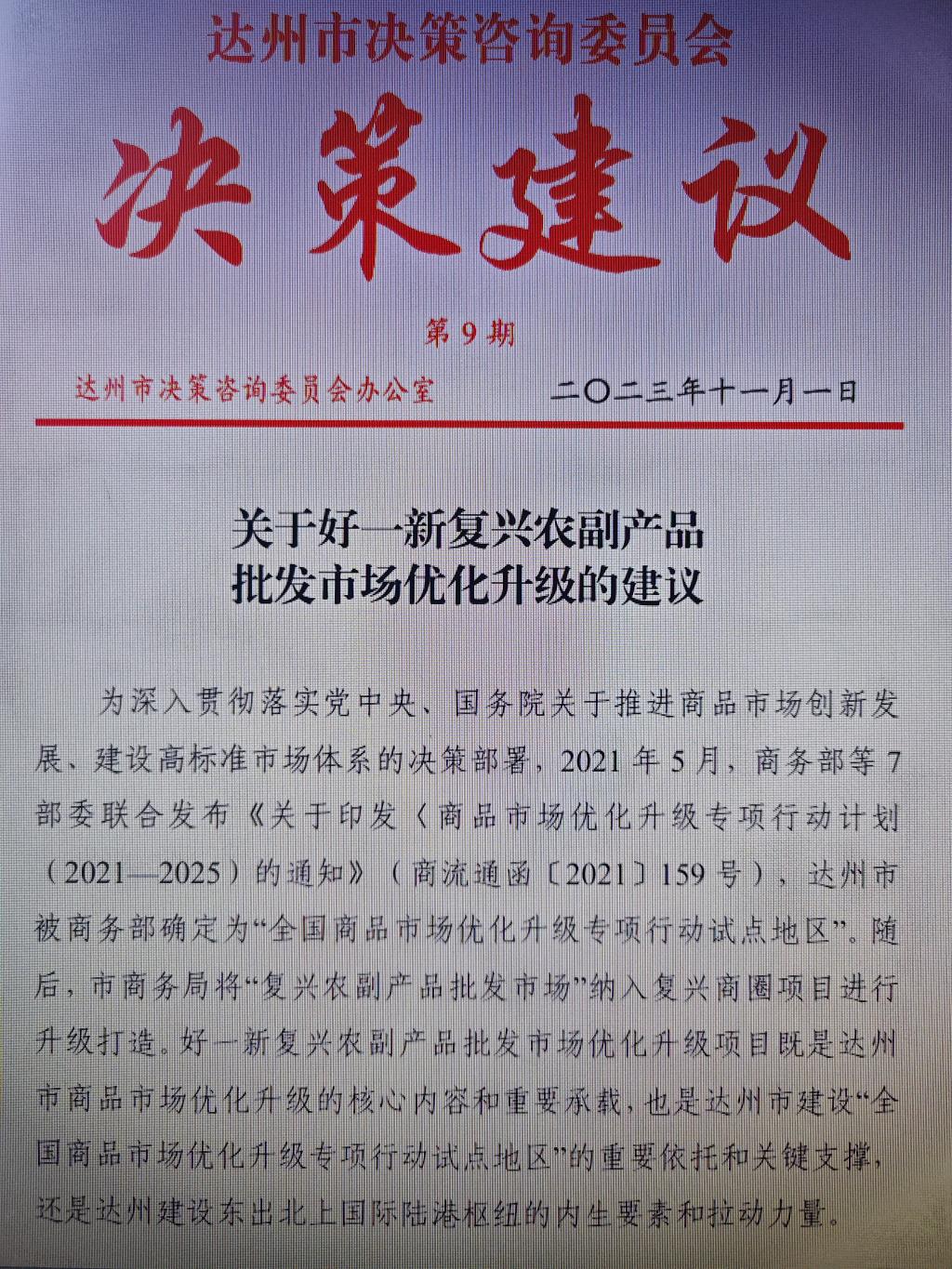 今日从达州市决策咨询委员会获悉,365英国上市集团经理傅忠贤教授带领团队提交的决策咨询建议《关于好一新复兴农副产品批发市场优化升级的建议》入选达州市决策咨询委员会《决策建议》2023年第9期,2023年11月11日获达州市市委副书记、市长严卫东同志肯定性签批。达州市决策咨询委员会批转达州市商务局进行成果转化运用。