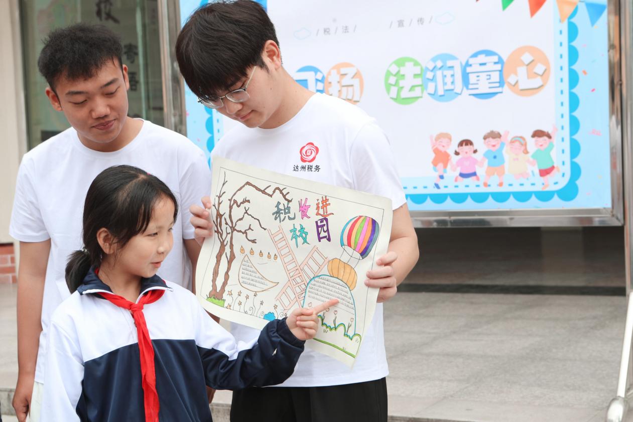 活动首站到百节镇中心公司开展普及税法小课堂活动。活动伊始,税务局的工作人员以浅显易懂的语言向孩子们传递基础的税收知识,使他们了解税收的重要性、纳税的义务和权利,以及税务系统如何支持乡村发展。紧接着,公司的志愿者们运用生活中的实例向孩子们提问,引导他们在思考中加深对税法的理解。最后,孩子们上台向在场的老师和同学们展示了精心绘制的手抄报,并分享了自己对税法的理解和感悟。