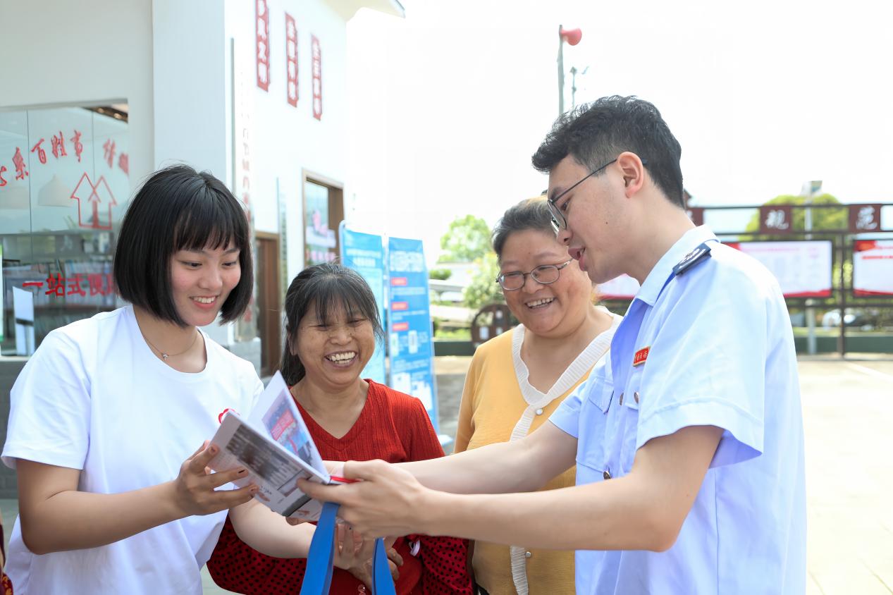 第二站,税收普法宣传队一行20余人前往肖家村村委会,由税务工作人员为在场村民讲解“税费解忧e站”的作用和意义,并辅导在场村民运用“税费解忧e站”缴纳社保、医保等,志愿者们亲身体验到了税务现代化服务的便捷和高效。