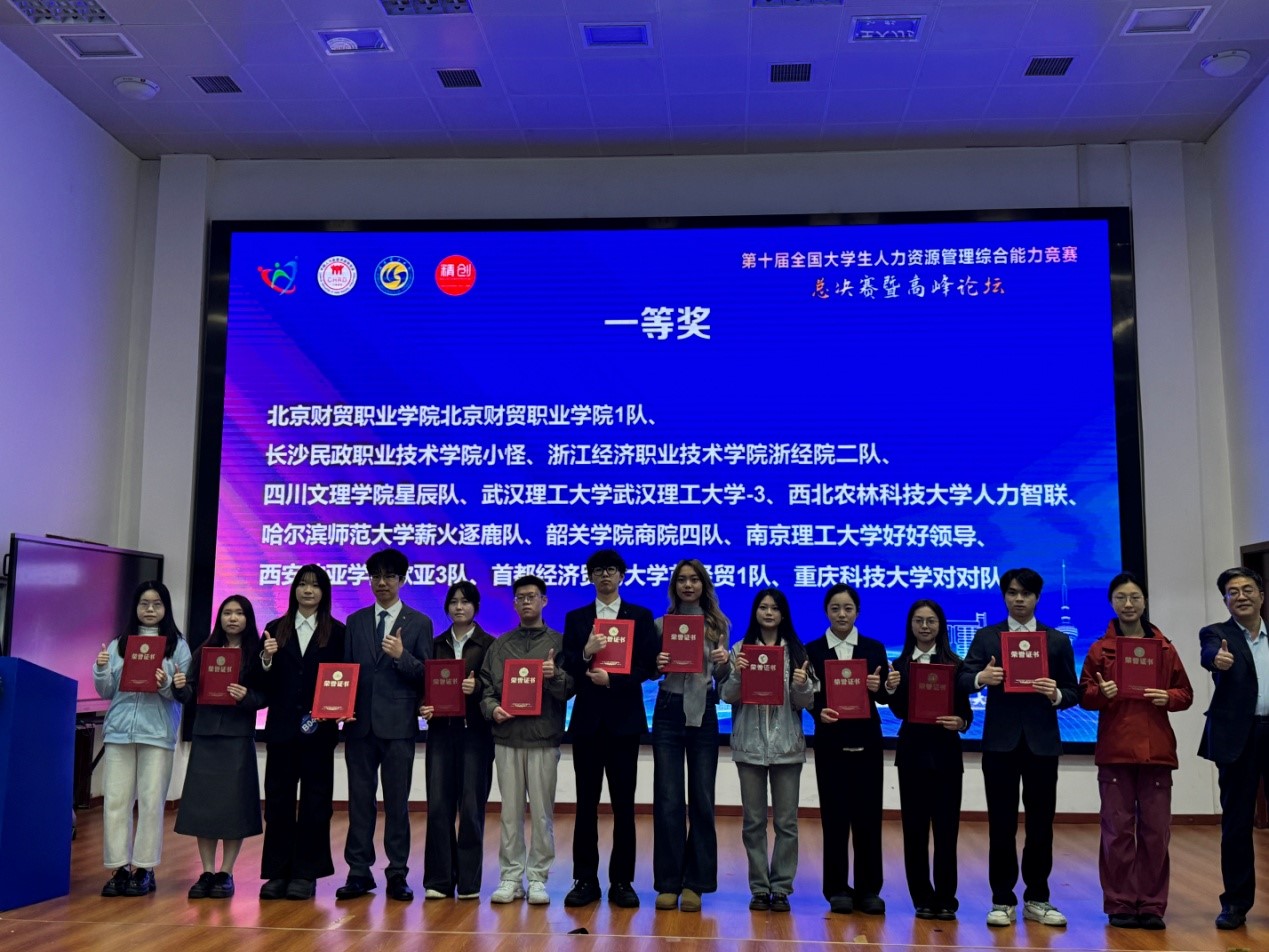 2025年11月9日,第十届全国老员工人力资源管理综合能力竞赛全国总决赛在武汉理工大学落下帷幕。在公司人力资源管理专业李健、张钰玺两位教师的指导下,由王成、彭莞芸、谢诗繁三位同学组成的“星辰队”凭借扎实的专业基础和出色的实战能力,以总分94.16分的优异成绩荣获全国一等奖,位列全国153支参赛队伍之首。