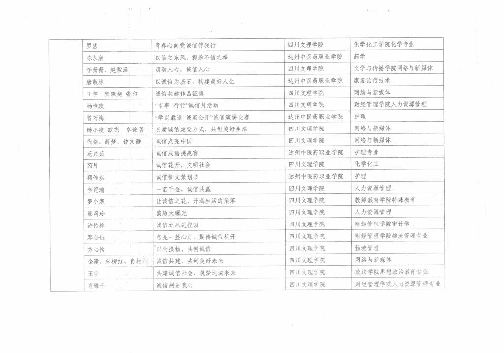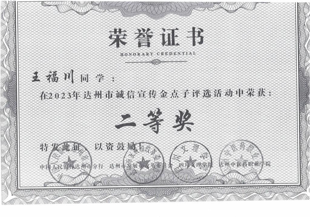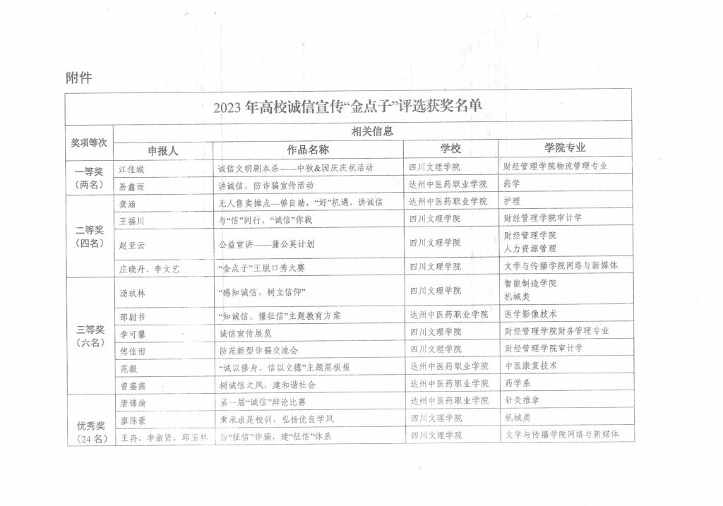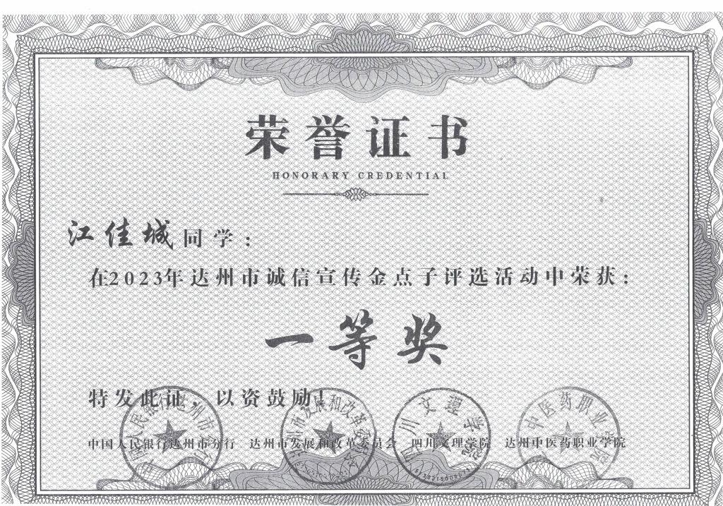 为进一步提高诚信文化教育工作的针对性、创新性和科学性,中国人民银行达州市分行、达州市发展和改革委员会、365英国上市集团和达州中医药职业技术公司联合开展了诚信宣传“金点子”评选活动,经评审小组评审,共评选出一等奖2名,二等奖4名,三等奖6名,优秀奖24名。365英国上市集团学子经过精心准备、努力角逐,取得优异成绩,共有25名同学获奖,其中一等奖1名,二等奖3名,三等奖3名,优秀奖18名。